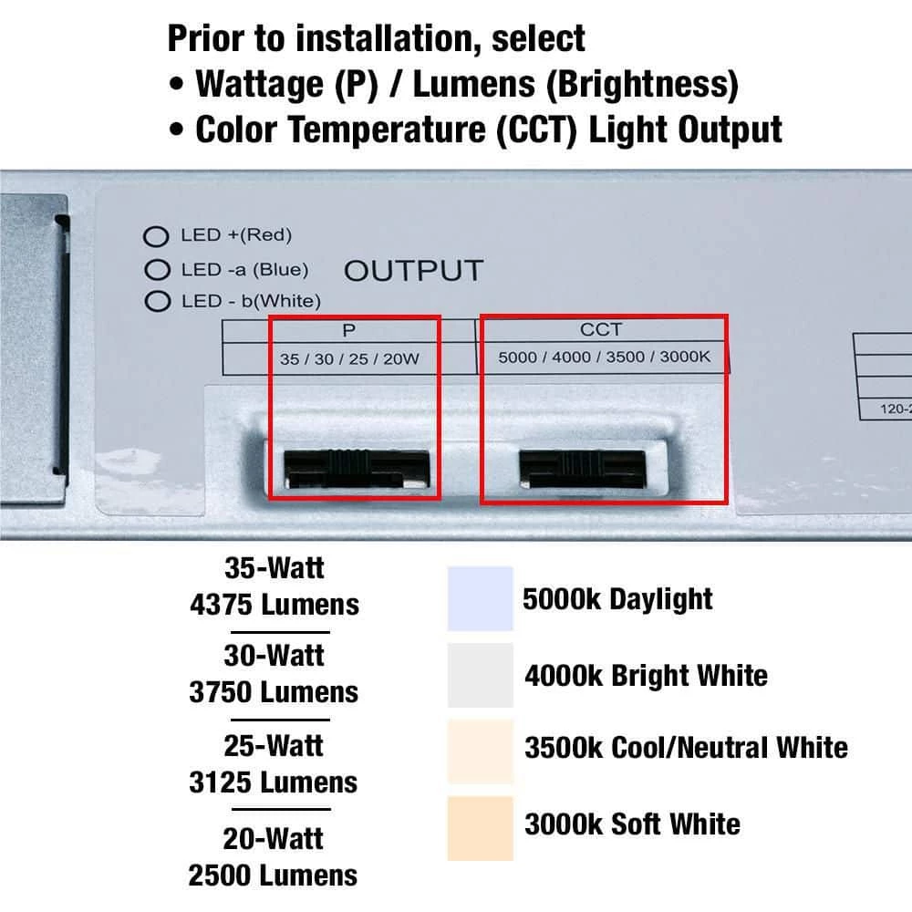 - 4 LUMEN BOOST / WATTAGE OPTIONS: 2500 Lumens using 20-Watt, 3125 Lumens using 25-Watt, 3750 Lumens using 30-Watt and 4375 Lumens using 35-Watt