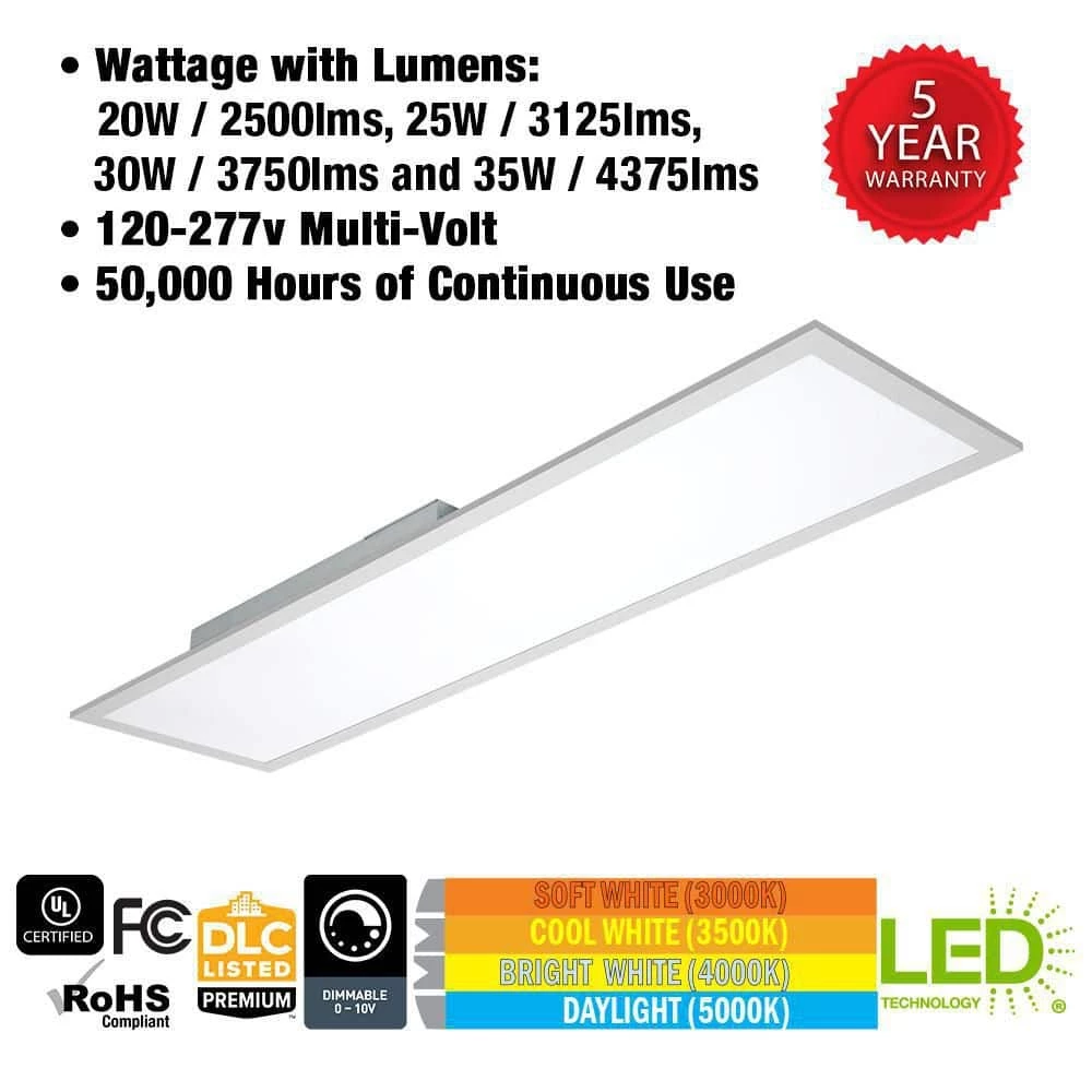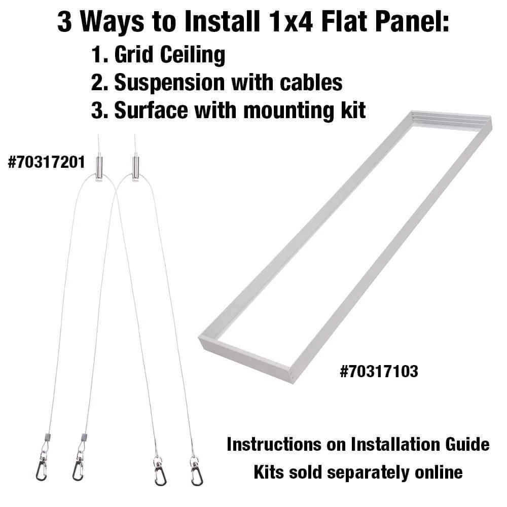 ETi 1×4 LED Flat Panel ceiling lights provide adjustable color and light output settings to ensure you find the perfect light in any space. Our flat panels provide efficient and smooth glare-free illumination. This panel is DLC Premium rated and delivers a maximum of 4,375 Lumens of extremely uniform ambient illumination. Prior to installation, choose between 4 color temperatures Soft White, Cool White, Bright White or Daylight by using the slide switch on the back of the fixture. Installation is a breeze with 3 ways to mount, Surface Mount, 2-Cable Suspension Mount, or Recessed Drywall Mount. (mounting kits available online). This flat panel light provides long-lasting maintenance free service with no bulbs required. Great for office, conference room, break room, hallways, schools, daycare, retail stores, government buildings, libraries and much more.