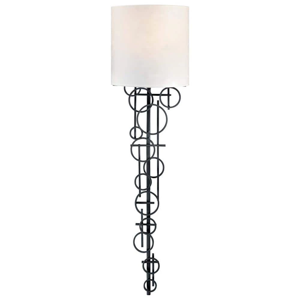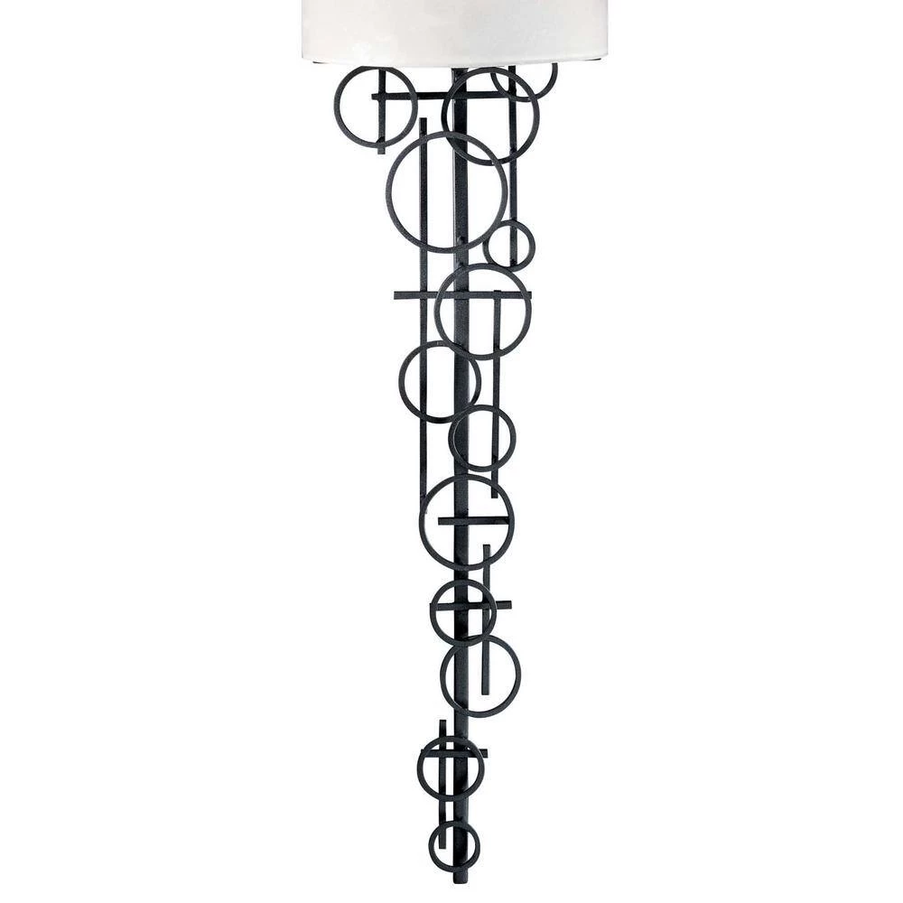 Warm light and modern, geometric details spill from the George Kovacs Wall Sconce. The jumble of circles and straight lines that comprise the black-finished frame maximize the fixture’s sense of vertical height as well as add a mid-century/retro artistic element to a wall. This George Kovacs fixture has a soft light that is diffused through the Pearl Mist glass shade that sits flush against the wall.