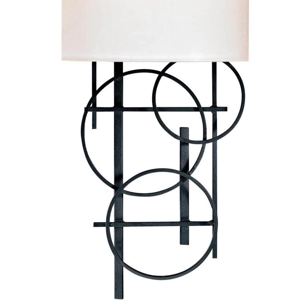 The George Kovacs Wall Sconce is both a reliable light source and a piece of eye-catching wall art. Light is diffused warmly throughout a space through the Pearl Mist glass shade that sits flush against the wall. Meanwhile, below, the black-finished frame is a jumbled series of lines and circles, creating a mid-century/retro artistic effect.