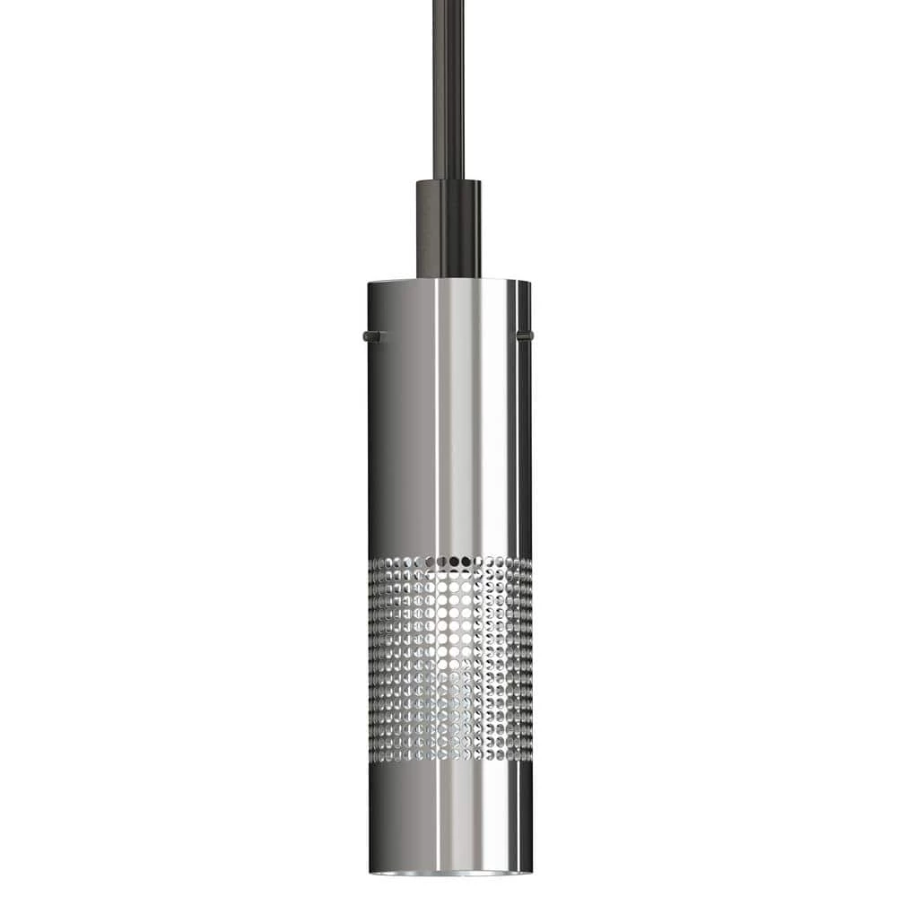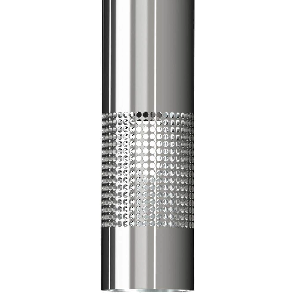 - Featuring a coal finish with a geometric frame with a perforated and patterned brushed nickel shades