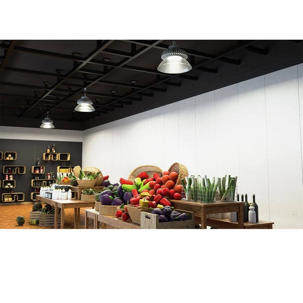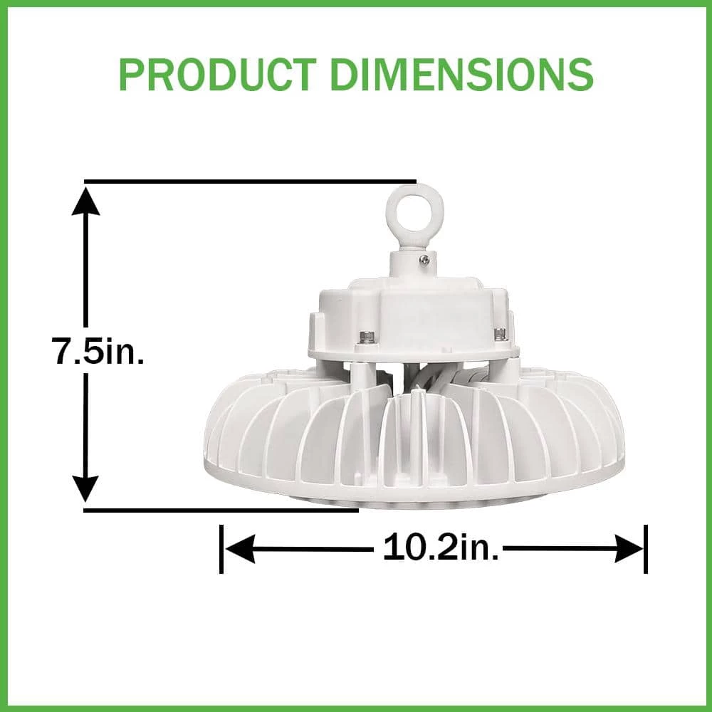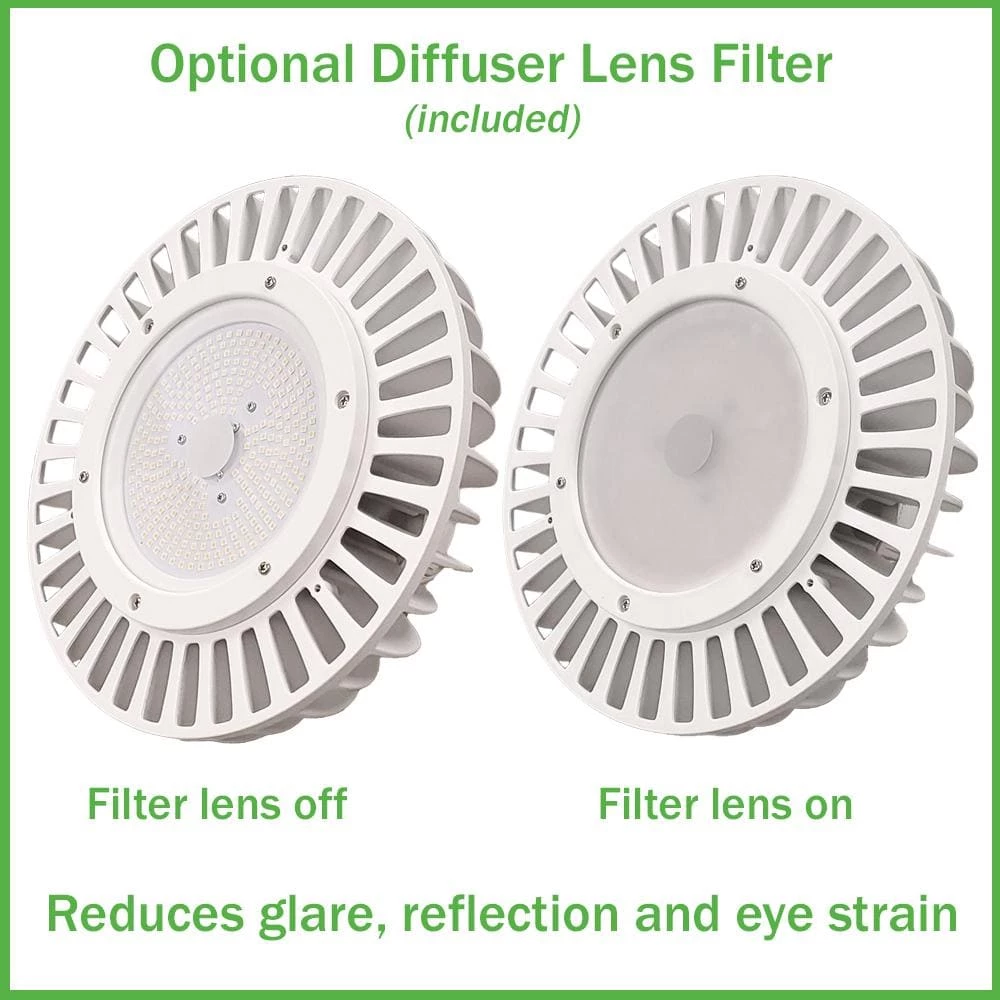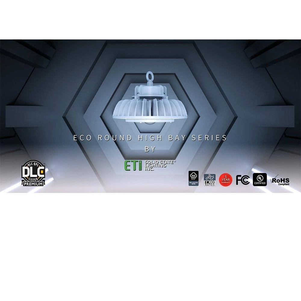 ETi 120W 10in. Round LED High Bay combines a robust and durable die-cast design with excellent performance. With its universal round form factor, it is ideal for many new construction, retrofit commercial and industrial applications. It is constructed of die-cast white primary housing with specially engineered alternating heatsink fins and dedicated slots to help promote pass-through convective cooling. This high bay delivers uniform light distribution optimized for most general open space applications, suggested ceiling height between 20ft. to 45+ft. Included in the box is an optional diffusing lens filter that can be easily installed to help significantly reduce direct-view visual glare and brightness for superior visual comfort within the space when needed. Suggested applications are warehouse, gymnasium, recreational space, retail, schools, loading dock, assembly lines and production facilities, large conference halls, event centers and even airplane hangars.