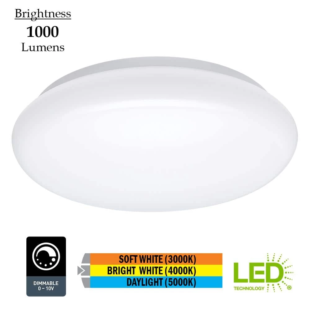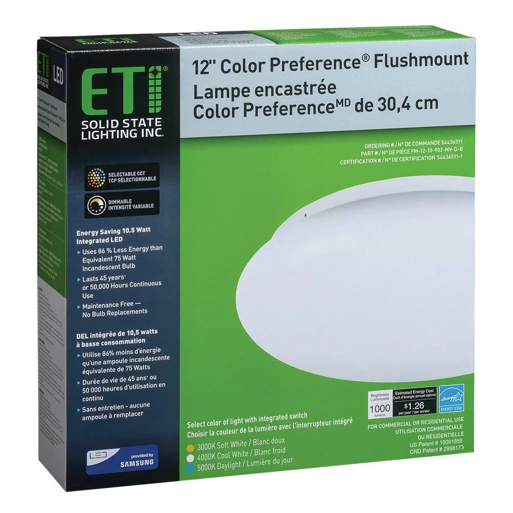 ETi’s Low Profile 12 in. LED Flush Mount Ceiling Light is designed to easily convert incandescent bulbs into a cool energy-efficient integrated LED fixture. Choose between 3 color temperatures of light output: 3000K Soft White, 4000K Bright White or 5000K Daylight and dimmable. You can always change your mind. It emits 1000 Lumens of brightness using only 16-Watt of electricity. Uses 81% less energy than equivalent 75-Watt incandescent bulb. It is lightweight, easy to install and maintenance free with no bulbs to replace. Ideal for kitchens, bedrooms, bathrooms, closets, stairways, hallways, basement, laundry room, playroom, den/office, storage room or utility room.
