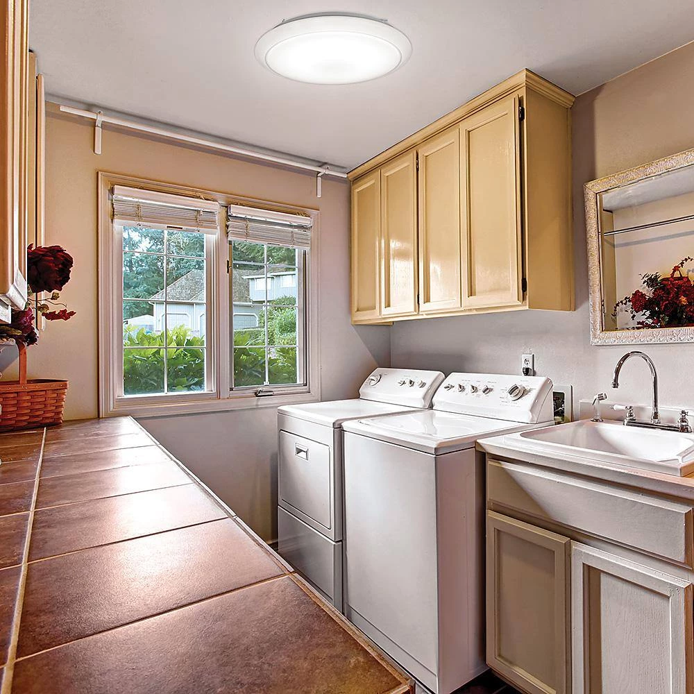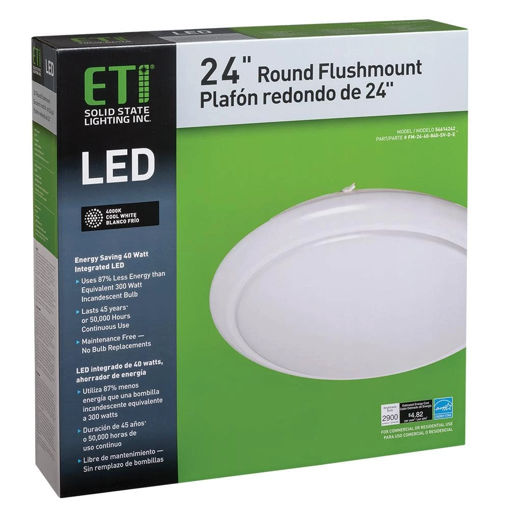 ETi’s 24 in. Round LED Flush Mount Ceiling Light easily convert incandescent bulbs into a cool energy-efficient integrated LED fixture. It emits 2900 Lumens of 4000K Bright White light using only 40-Watt of electricity and dimmable. This light reduces energy consumption by as much as 87% compared to conventional lighting units. It is a high quality LED replacement fixture for an equivalent two 150-Watt incandescent bulbs. This fixture is lightweight, easy to install and maintenance free with no bulbs to replace. Ideal for kitchens, bedrooms, bathrooms, closets, laundry room, stairways, hallways, basement, playroom, storage room or utility room.