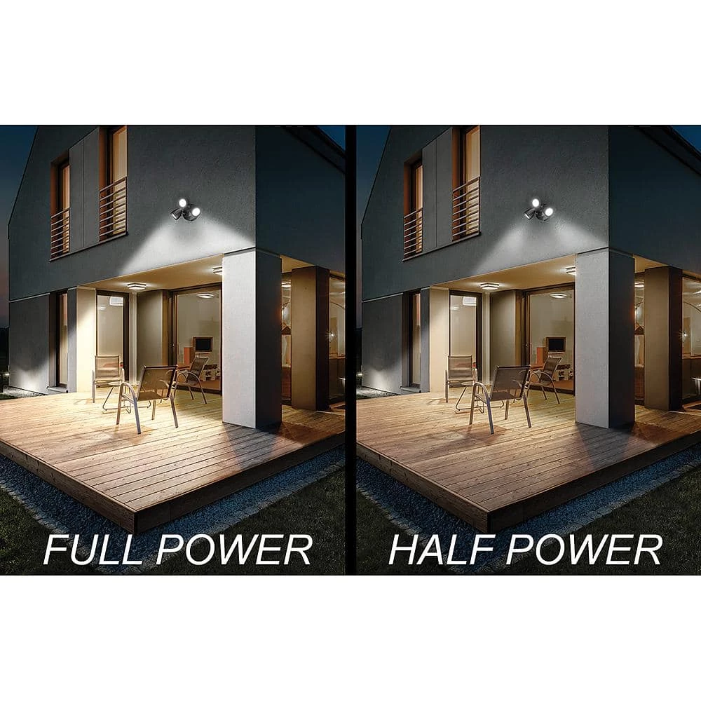 Security lighting is highly suggested by most neighborhood watch or HOA’s, police and insurance companies. ETi has the perfect solution for all your outdoor lighting needs. With our 3-Head security light, choose Dusk to Dawn or Lumen Boost features for whichever works best for your home or business. Dusk to Dawn is best for lights to automatically turn on at sunset and turn off at sunrise or choose Lumen Boost feature (intensity of brightness) from main light at 1200 Lumens to high intensity at 2400 Lumens. To adjust the twin light heads, you only need your hands to direct light beam angle where you need the most light. This is made of durable all-weather construction; perfect for sub-zero weather all the way down to -40°! No more worries about climbing a ladder or hiring an electrician to change light bulbs, this is maintenance free with no bulbs to replace. Our LED security flood light ensures an abundance of safety and awareness, prevents possible injuries and increases property value. Ideal for driveways, backyards, decks, porches, and dark corners on side of house. ETi 3-Head security light will provide your family “triple” peace of mind.