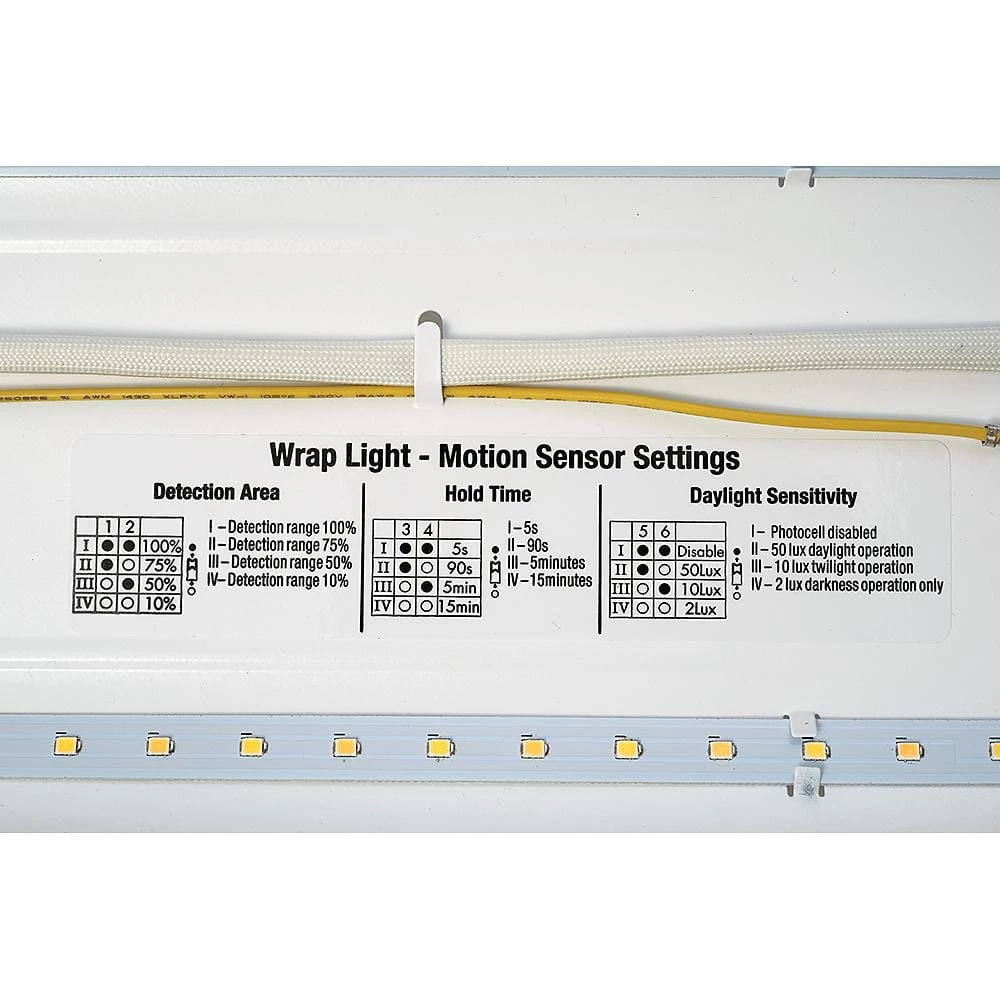 ETi’s 4 ft. LED Wraparound Light with Step Dimming Motion Sensor is designed to replace any outdated fluorescent light with an energy-efficient LED fixture. Using DIP switch on the motion sensor, this allows you to customize the motion sensor with adjustable hold times and adjustable daylight sensor. This fixture emits 3600 Lumens of brightness providing 4000K Bright White light output using only 34-Watt of electricity. Replaces 2 glaring 32-Watt T8 fluorescent lights. There are three 7/8 in. knockouts for easy mounting and includes hardware needed for installation. Ideal for kitchens, laundry rooms, stairways, hallways, basements, storage/utility rooms or work bench area.