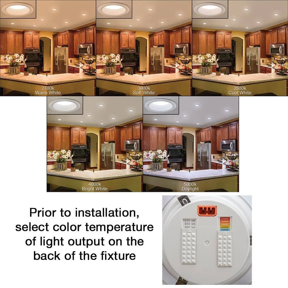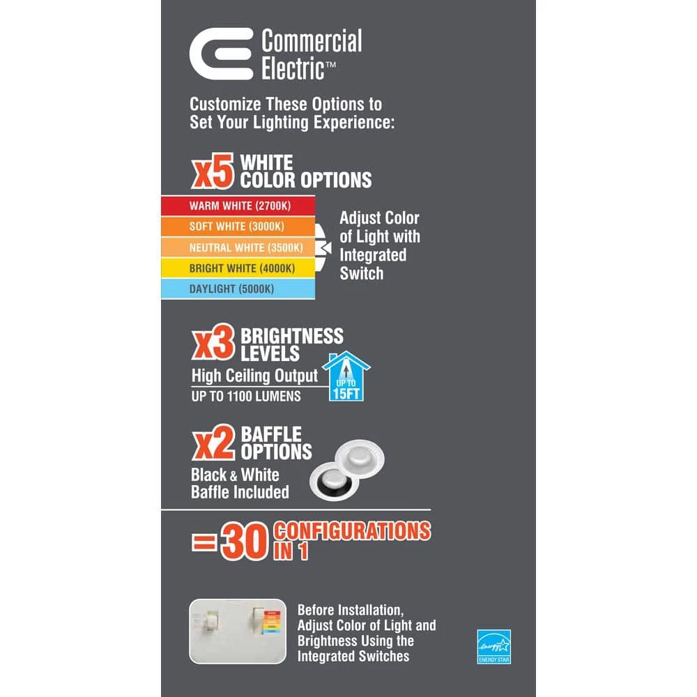ETi 6in. LED Recessed Trim Light has 30 light configurations in ONE fixture! This is an All-in-One customizable light fixture. With 5 color temperature light output options, 3 lumen brightness settings, and 2 baffle/trim colors equals 30 different configurations! You have the control and flexibility to fine-tune color and brightness for your lighting design layout. This fixture offers high ceiling output up to 15 feet using 1100 Lumens of brightness; a perfect solution for large spaces that require maximum lumen output. Ideal for vaulted ceilings, grand entry ways, sloped or slanted ceilings, large kitchen, bathrooms, basement, office, retail stores, restaurants, entertainment spaces. This light is easy to install, lasts 50x longer than incandescent bulbs and is maintenance free with no bulb to replace. Everything is at your fingertips with just a flip of a switch.