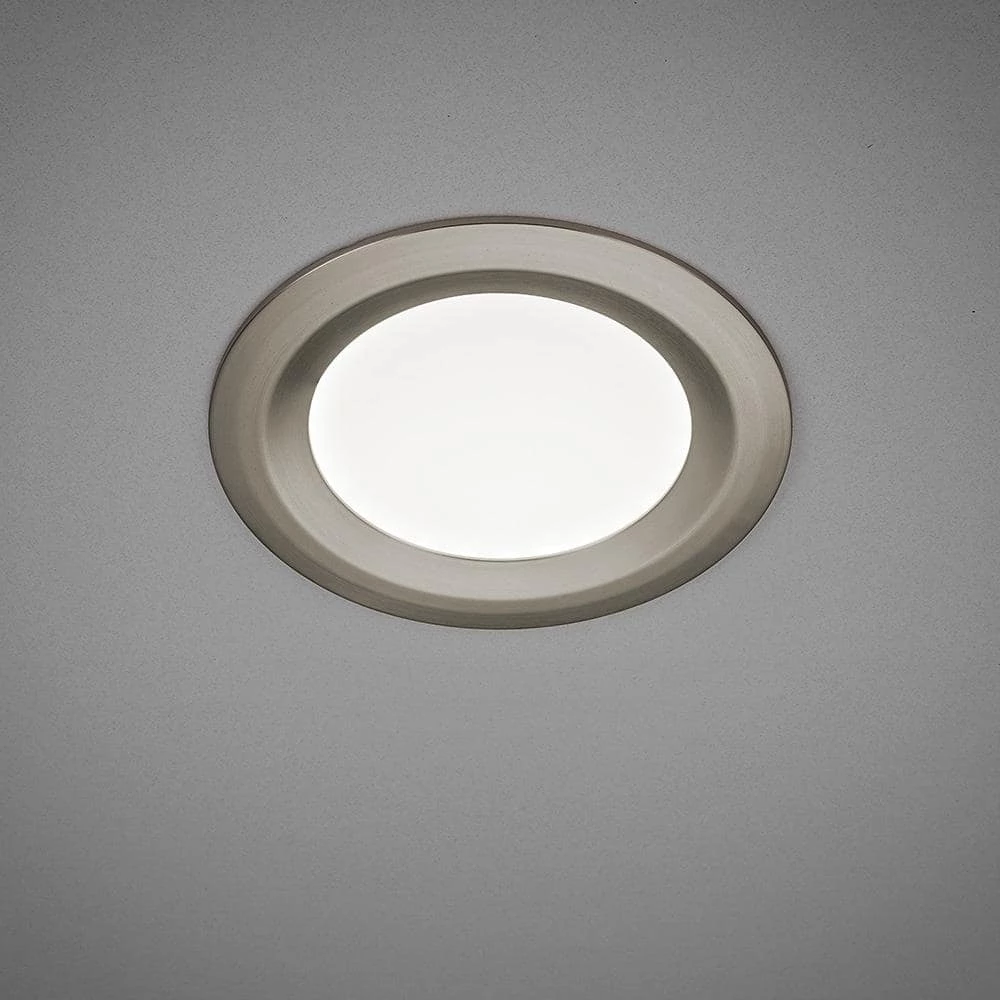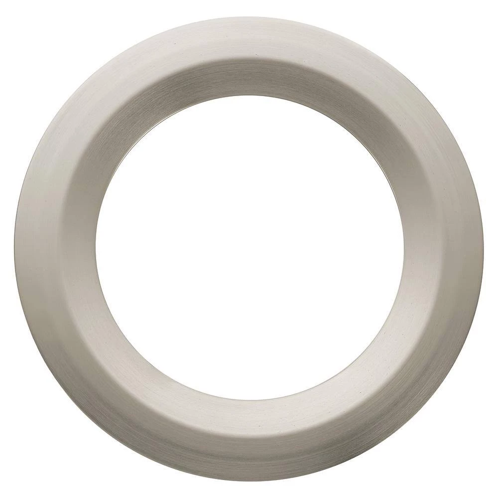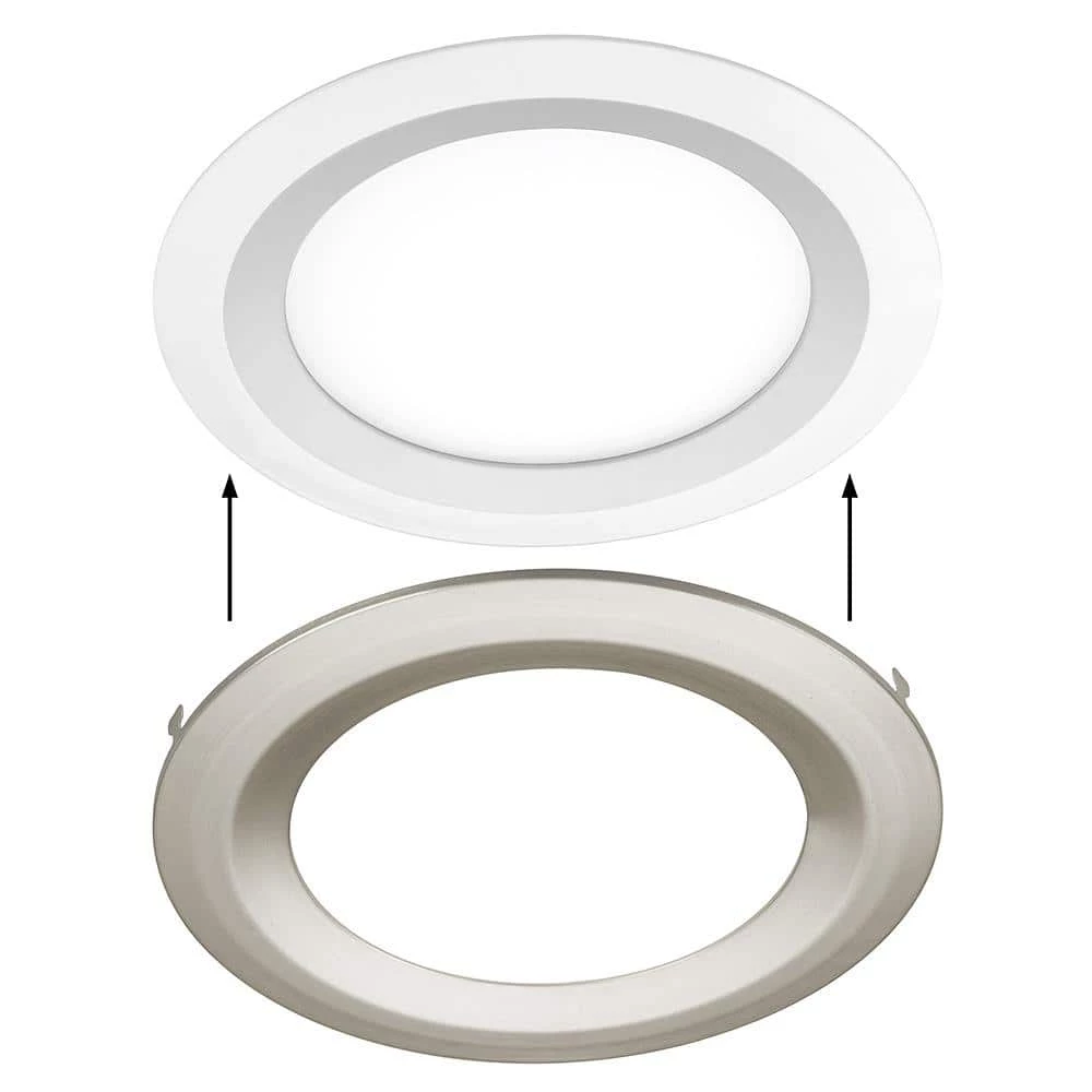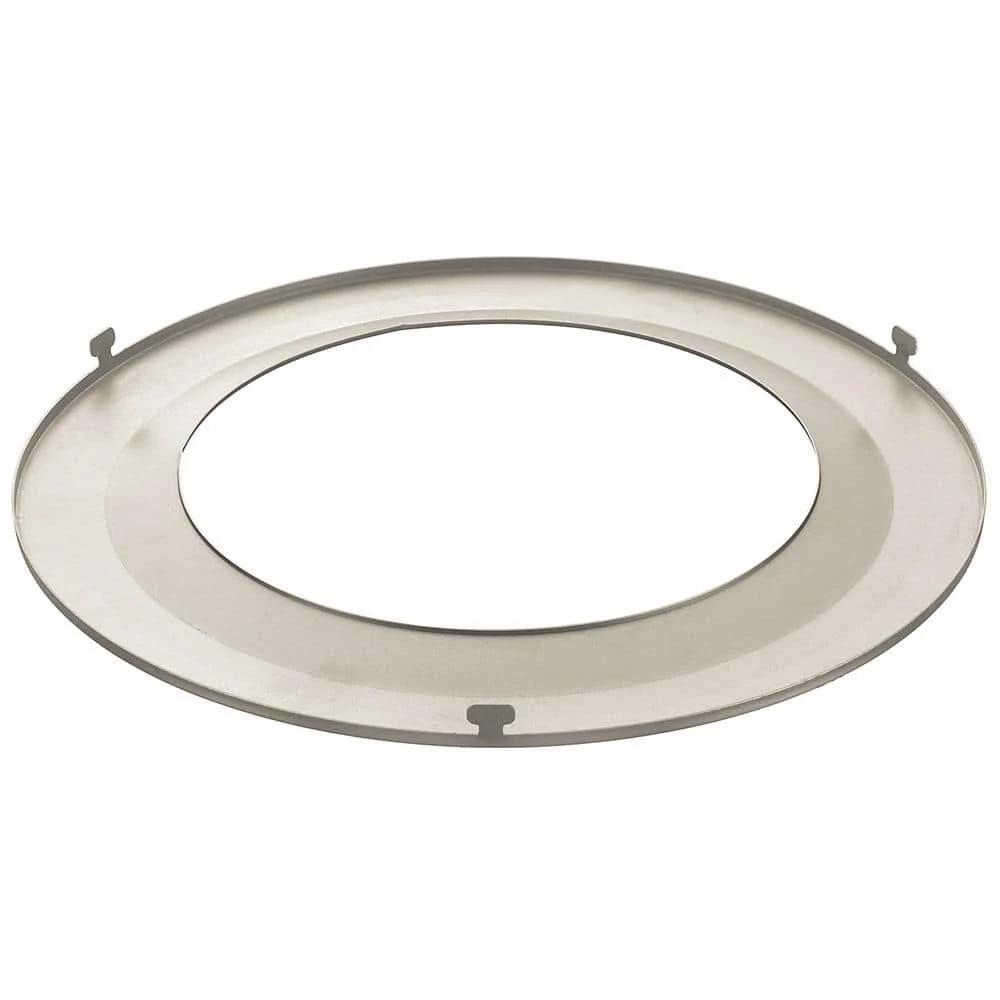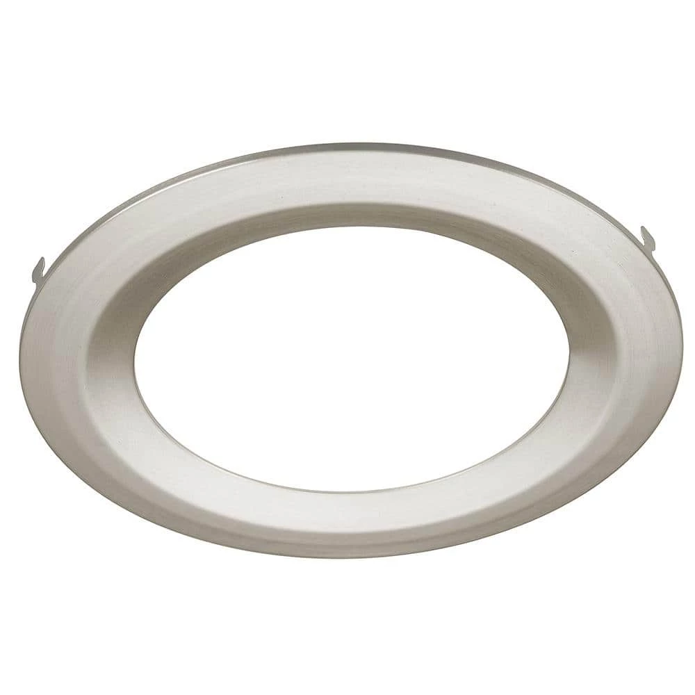 ETi 6in. Brushed Nickel Trim provides you the option to enhance your lighting decor by covering the existing white trim with a colored trim. This beautiful upgrade will be a seamless compliment to your decor. Simply take your desired color trim, gently place onto the fixture and then pull down the little tabs to lock the trim in place. This trim is only compatible with Commercial Electric 6in. Canless LED Recessed Downlight – Model#’s 53807101, 53807101-4PK and 53807101-8PK and ETi 5in./6 in. Canless LED Recessed Downlight – Model#’s 53807211 or 53807211-8PK. Additional trim colors available in Black and Oil Rubbed Bronze – sold separately.
