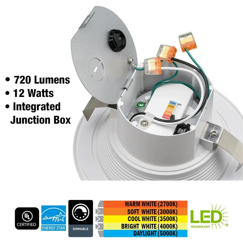 ETi 6 in. Canless Recessed Downlight with Integral J-Box is one of the most versatile and easiest ways to upgrade your existing recessed lights to energy-efficient LEDs. This innovative fixture has no need for recessed cans or a separate J-box, so its ultra slim design easily installs into low clearance or sloped ceilings. Equipped with our Color Preference technology to choose between (5) color temperatures of light at install. The fixture is dimmable, down to 10% without any flickering or buzzing and is suitable for any damp locations. It is easy to install, long-lasting and maintenance free with no bulbs to replace. Ideal for kitchen, bed/bathroom, pantry, entry way, hallway, stairwell, basement, sun room, covered patio or deck, office, retail shops or lobby.