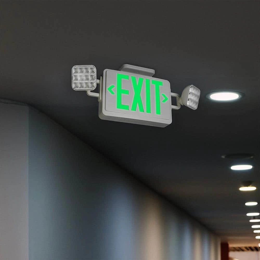 ETi’s LED Emergency Light Exit Sign Combo is a complete emergency Alert system with backup lights. It has easy to read Green LED lettering with 2 LED lights on either side of sign. There is a test switch, charge indicator and has Lithium-Ion battery backup. This sign is made of durable flame retardant thermoplastic material which withstands heat and smoke. It complies with NTPA 101, OSHA and UL924 Listed emergency codes and is Title 20 compliant. 2 ways to mount: ceiling or wall. This is a maintenance free fixture with no bulbs to replace.