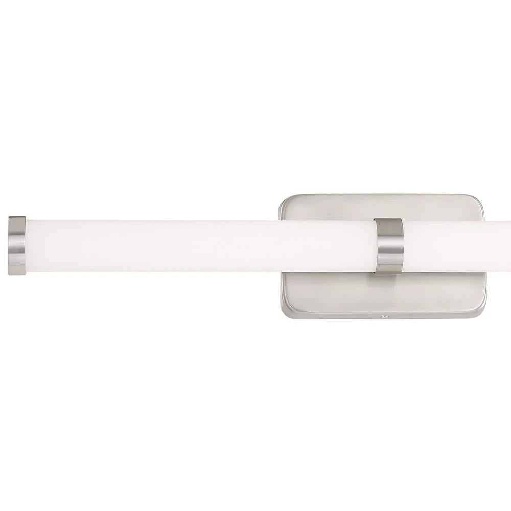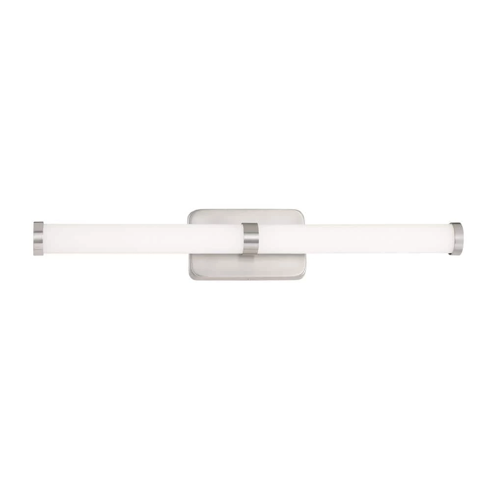 The sleek, modern design of the LED Bath Bar by George Kovacs features a rounded Etched White glass and rectangular wall plate. A Brushed Nickel band and endcaps give the shade definition as it offers widespread LED illumination to the surrounding area. Its structural simplicity makes it highly versatile, mounting either vertically or horizontally in a variety of bathroom settings.