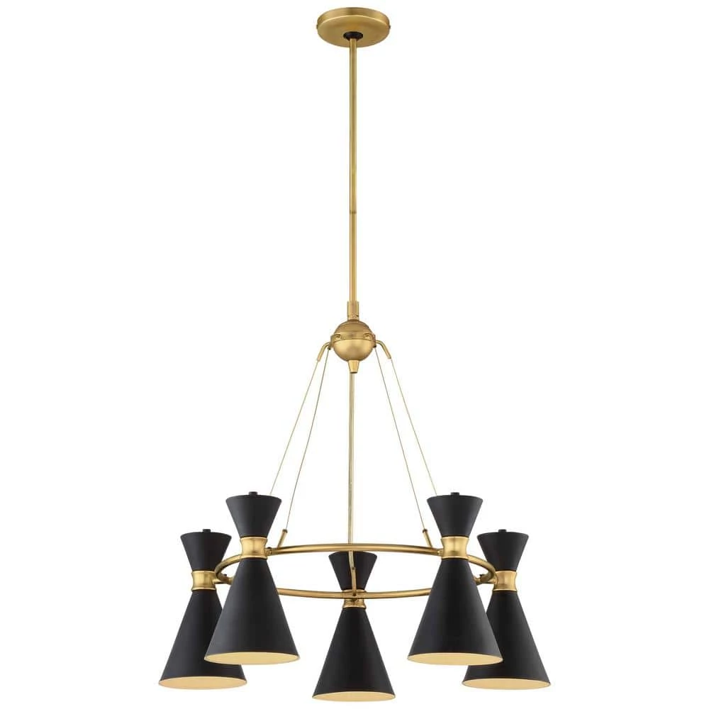 The Conic Collection by George Kovacs is a sleek, geometric centerpiece fit for todays interior settings. Its design features an array of bi-conical shades that are partitioned and supported by a thin Steel ring. The shades tapered form allows light to funnel down in concentrated pools without significant glare, giving you focused coverage that is as pleasant as it is useful. Available as a series of pendants and chandeliers, Conic sets itself apart with three unique finishes: Brushed Nickel frames with shades available in a warm Distressed Koa or sleek Gloss White and Matte Black shades with a Honey Gold frame.