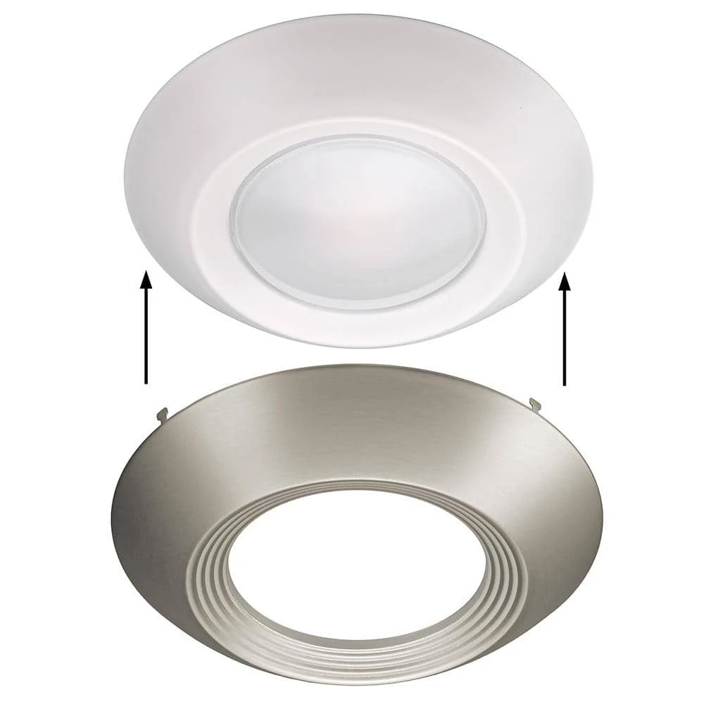 ETi’s 5 in./6 in. LED Recessed Trim Disk Ceiling Light is designed with an innovative TwistFit mounting system makes installation quick, simple and insures a tight, no-gap fit against ceilings. (See image of step-by-step process.) There are two installation methods, mount into recessed can or mount into a 3 in. to 4 in. octagonal J-box. (Torsion springs, bracket, adapter included). The total trim width is 7.5 in., but you only need to cut a 5 in./6 in. hole for installation. The additional width offers even more coverage for crystal clear illumination. The Brushed Nickel Trim Cover is designed to compliment your room in an instant simply by covering the existing white trim on the disk light. Take the trim cover, snap on top of existing white fixture and fold over the tabs for a secure fit. Done. To install the whole fixture into your desired space, refer to mounting options below and in the Instruction Manual. This fixture emits 1000 Lumens of brightness with premium LEDs using only 14-Watt of electricity and 3000K Soft White light output, and dimmable too. It is eco-friendly, long-lasting and maintenance free with no bulbs to replace. Ideal for kitchen, family room, living room, den/office, bedrooms, bathrooms, stairways, hallways, basement, laundry room or utility room.