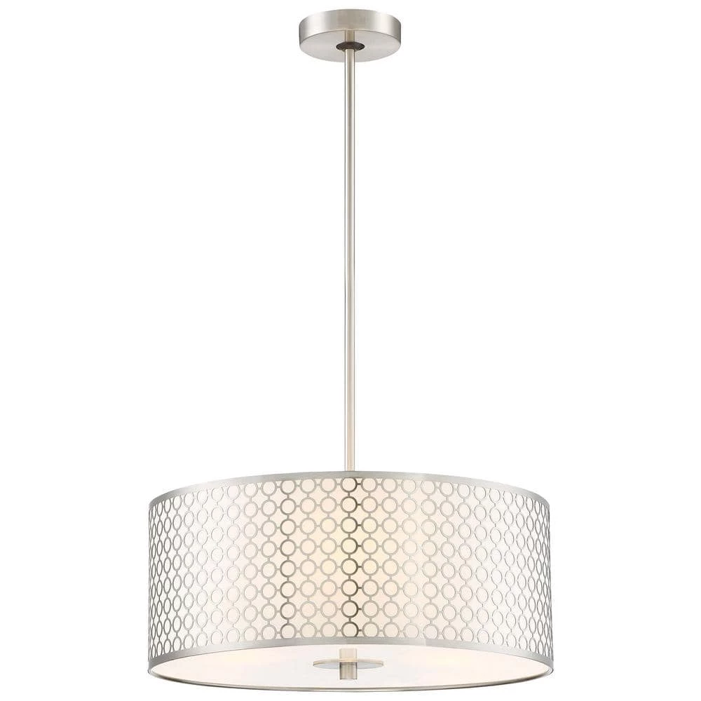 A refined metal grille defines the George Kovacs Dots Pendant, a crisp drum shade with a Brushed Nickel finish and Etched Glass diffuser. Small circles pattern the metal component of the design, allowing general ambient light to pass through the profile in addition to the generous amount of light shining below. This fixture is kept simple, making this collection a fabulous addition to any modern decor.