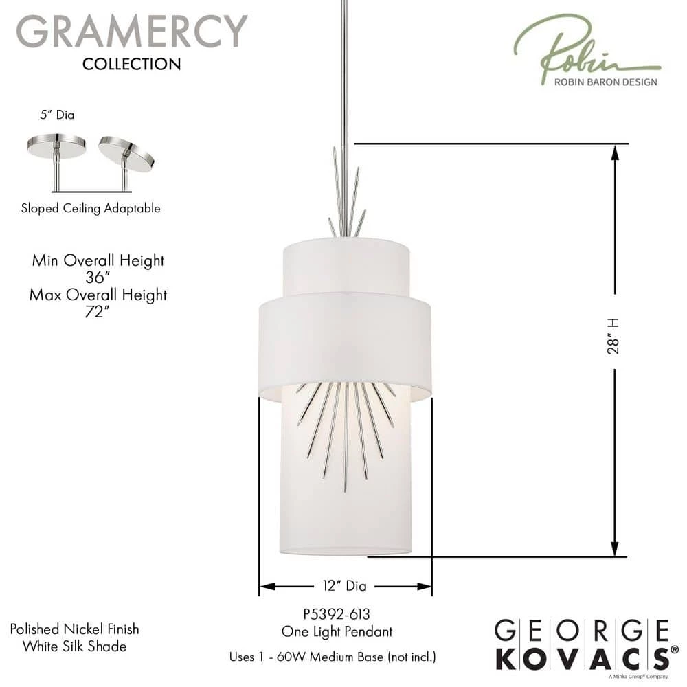 Gramercy designed by Robin Baron Design for George Kovacs will surprise you with its elegant appearance and classy looks. This pendant collection comes in Polished Nickel finish with a white Silk Cloth Shade. The pendants are engineered to allow adjustable hanging height up to 36 in. Modern, graceful, sophisticated, the Gramercy Collection designed by Robin Baron Design for George Kovacs is a one of kind light fixture that will be an expression of gratitude for years to come.