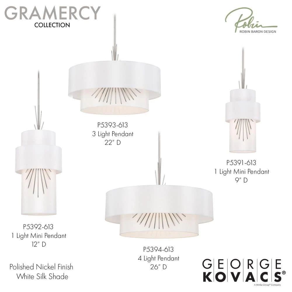 Gramercy designed by Robin Baron Design for George Kovacs will surprise you with its elegant appearance and classy looks. This pendant collection comes in Polished Nickel finish with a white Silk Cloth Shade. The pendants are engineered to allow adjustable hanging height up to 36-inches. Modern, graceful, sophisticated, the Gramercy Collection designed by Robin Baron Design for George Kovacs is a one of kind light fixture that will be an expression of gratitude for years to come.