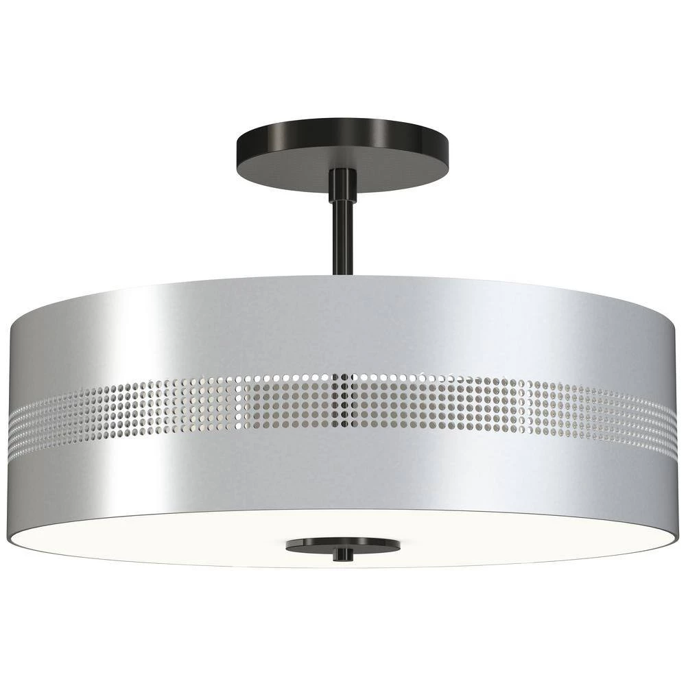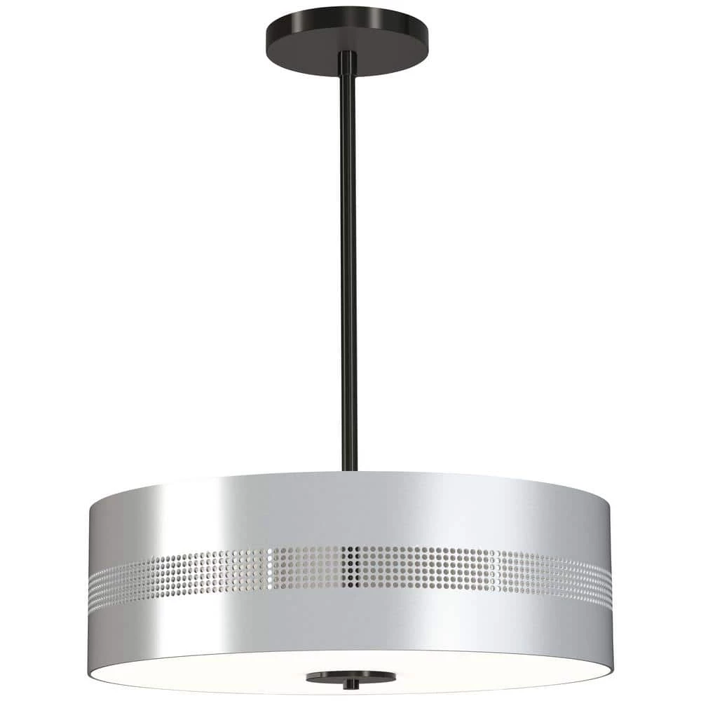 - Featuring a coal finish with a geometric frame with a perforated and patterned brushed nickel shades