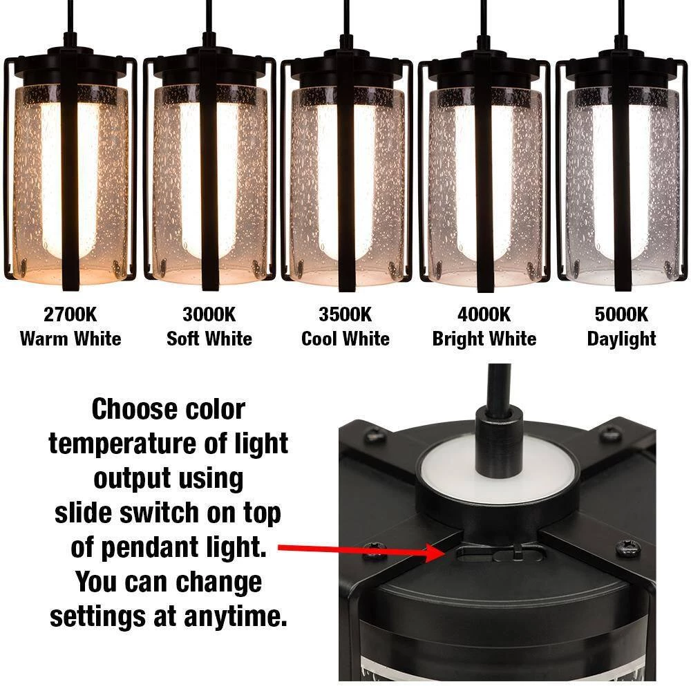 ETi Matte Black LED Mini Pendant Light is perfect over your kitchen island or table providing ambient lighting, task lighting or accent lighting. Our mini pendant is a cylinder-shaped seeded glass design with Matte Black metal grid offering unique textures to compliment any home. Select between 5 color temperatures of light output ranging from Warm White to Daylight using slide switch on top of the fixture. You can change settings at any time. For accent lighting, use the Night Light feature which glows a soft Amber hue on top of the fixture providing a calm warming environment for those romantic dinners or casual family gatherings. Install the fixture as alone or group together as the pendant’s stem is adjustable for a variety of decorating ideas. Suggested applications are kitchen island, dining room table, side table lighting, reading nook or entryway.