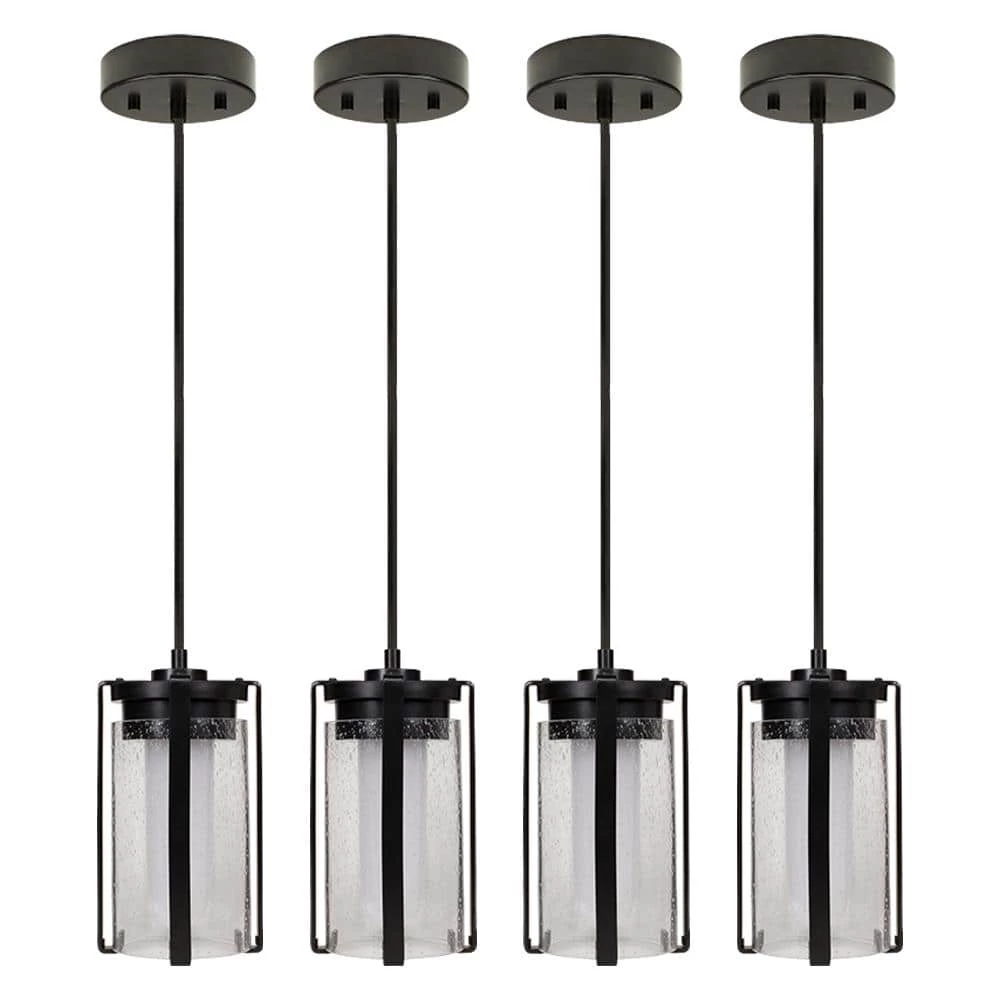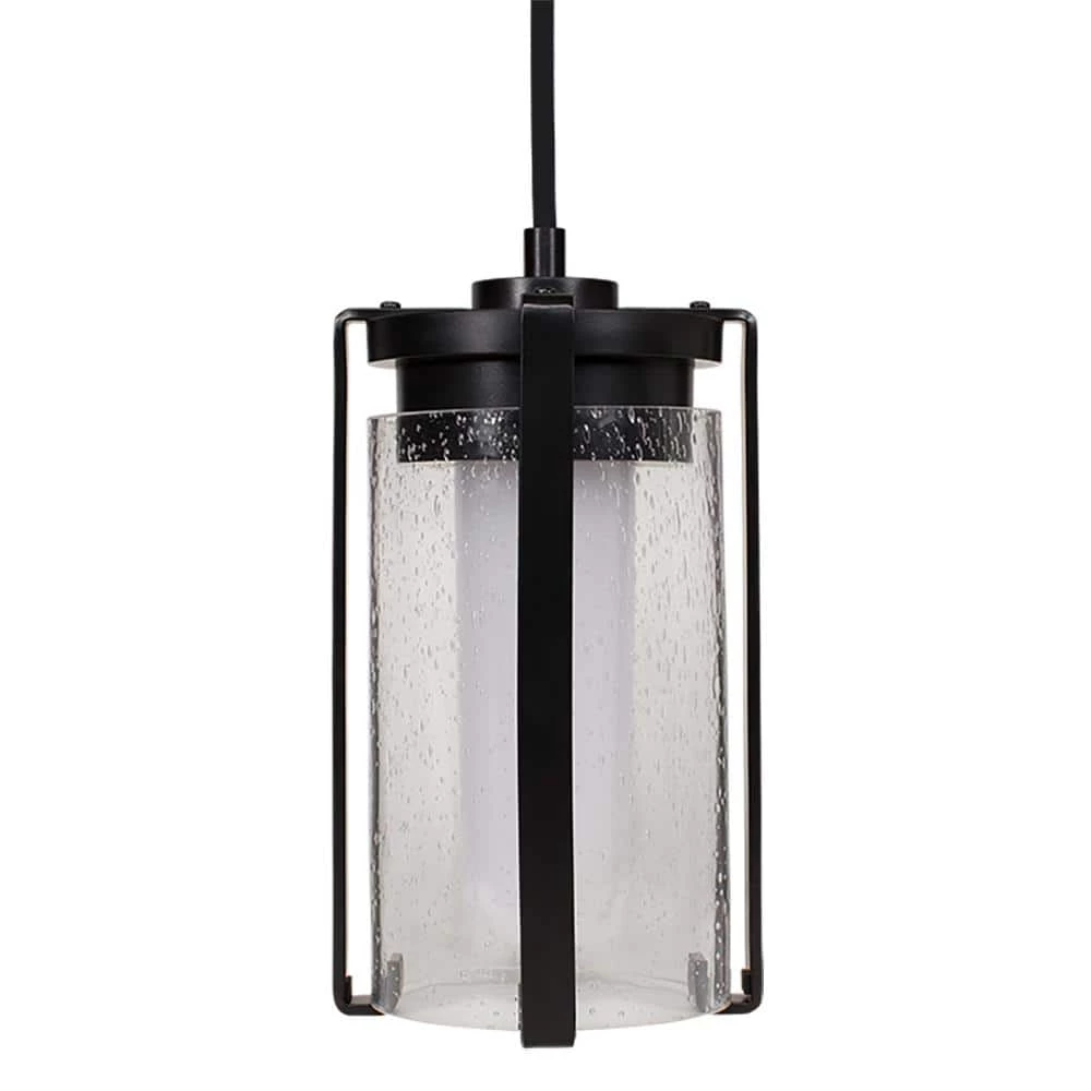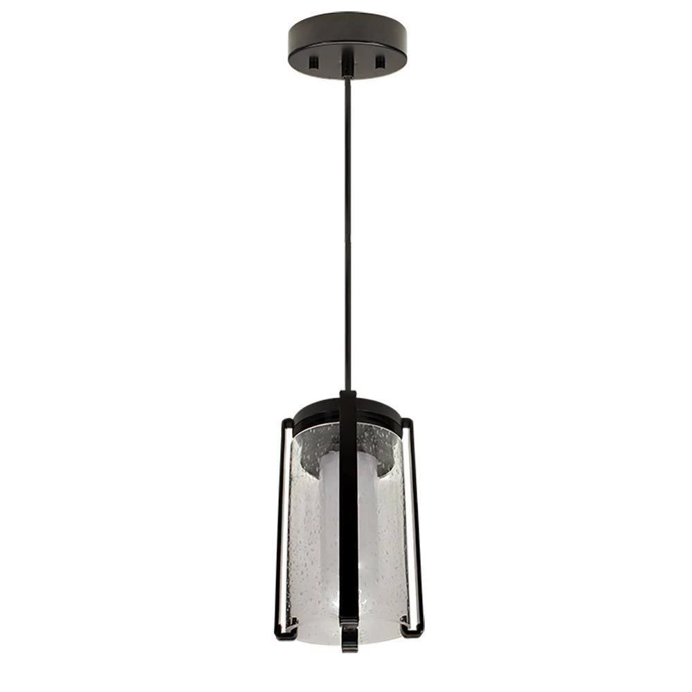 - LED Mini Pendant light is cylinder shaped with seeded glass design with Matte Black metal grid overlay