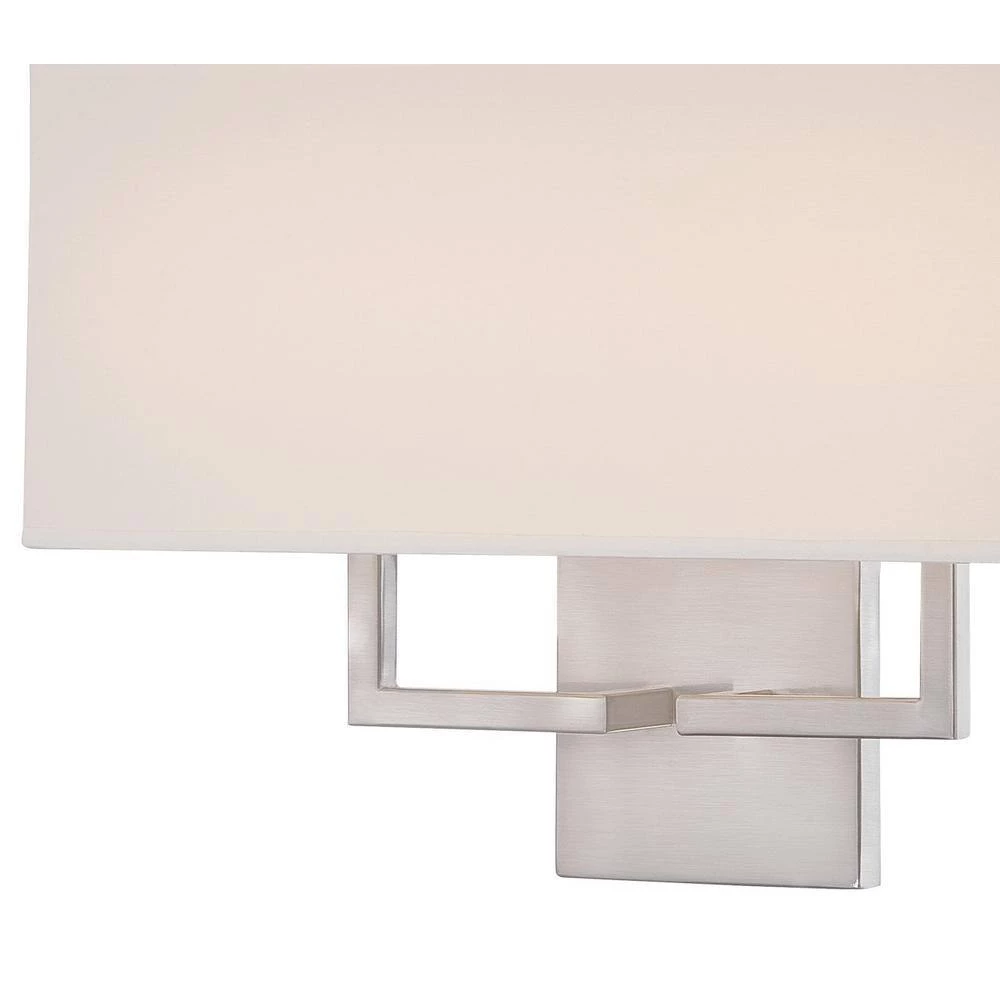 - Featuring a brushed nickel finish with a white fabric shade and etched diffuser