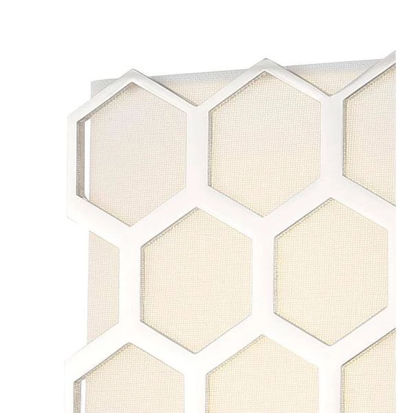 Are you mesmerized. Welcome to the Missing Link Collection from George Kovacs Lighting. A halo of Polished Nickel hexagons encompasses fine linen shades while the asymmetrical patterning brings an undeniable modern je ne sais quoi to the eye. The dynamic geometric arrangement provides a unique stylistic element while highlighting a transformative interior glow. Designed in 7 different configurations consisting of a LED wall sconce, 2 different size LED vanity lights, 1-light mini-pendant, 3-light pan pendant, 6-light pendant, and 6-light pendant convertible to semi-flush. The Missing Link, a modern geometric collection, created and designed by George Kovacs.