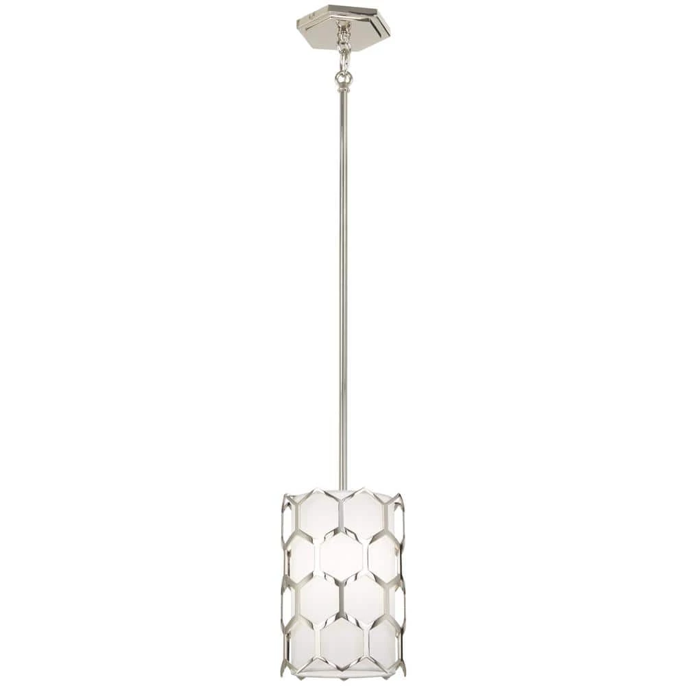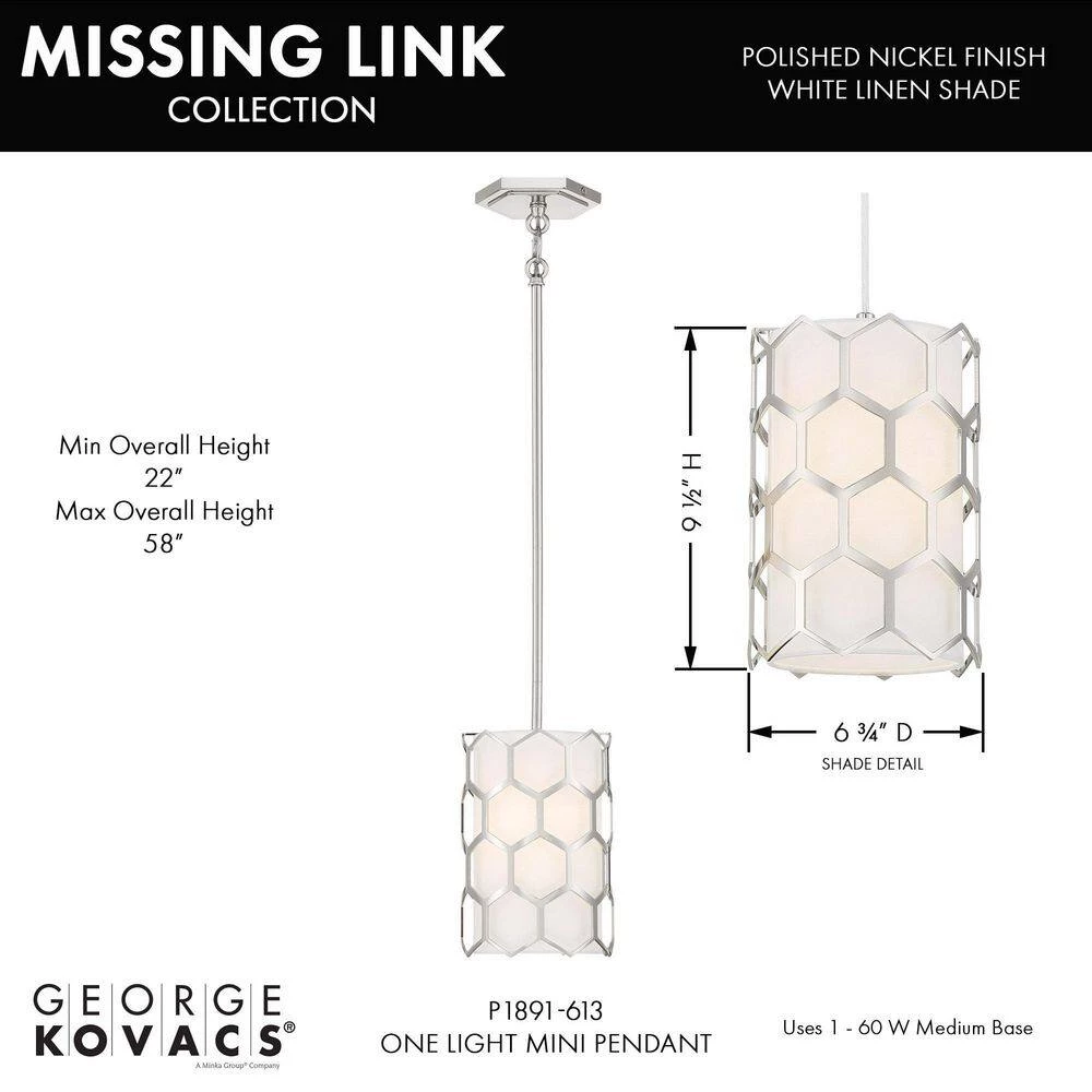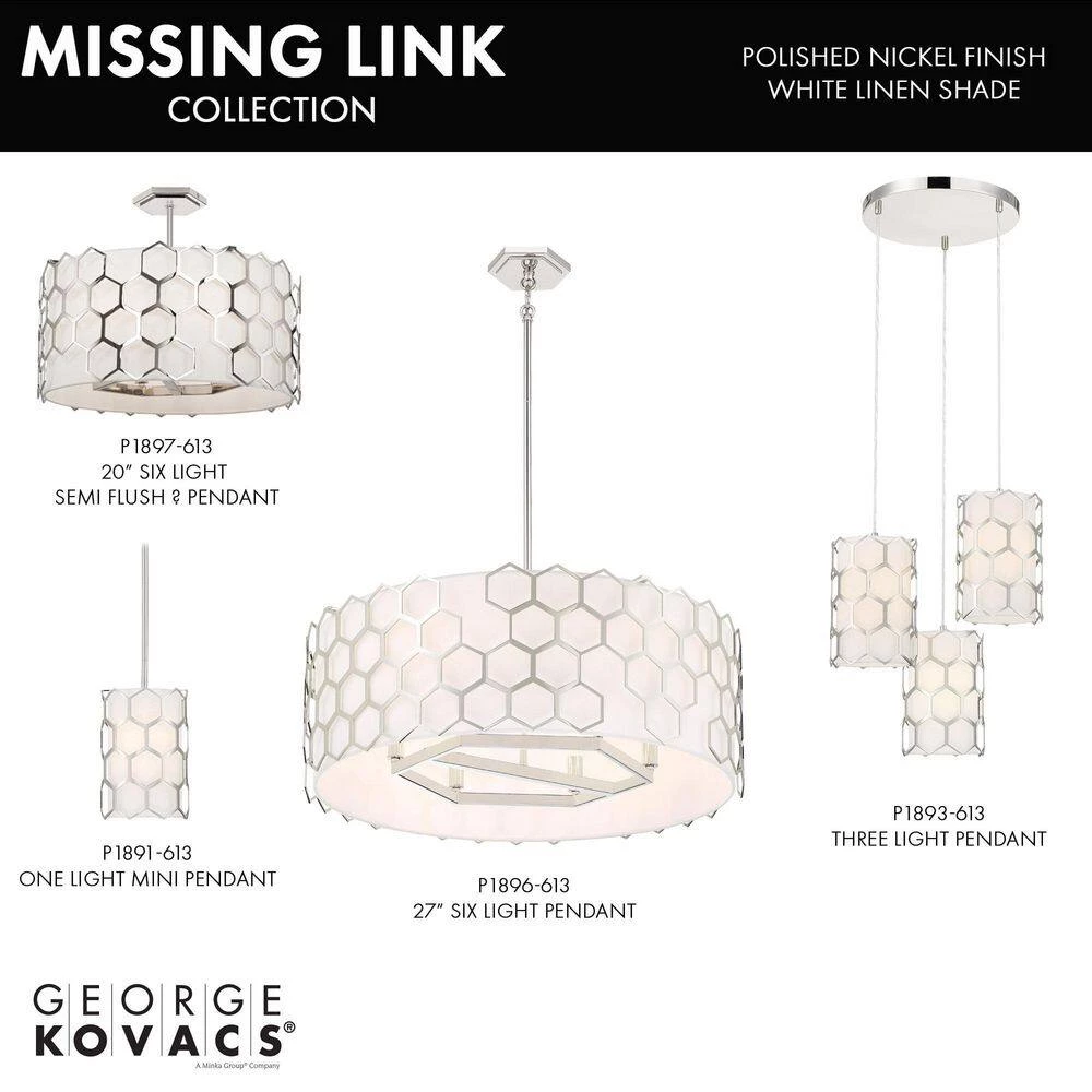 Are you mesmerized. Welcome to the Missing Link Collection from George Kovacs Lighting. A halo of Polished Nickel hexagons encompasses fine linen drum shades while the asymmetrical patterning brings an undeniable modern je ne sais quoi to the eye. The dynamic geometric arrangement provides a unique stylistic element while highlighting a transformative interior glow. Designed in 4 different configurations consisting of a 1-light mini-pendant, 3-light pan pendant, 6-light pendant and 6-light pendant convertible to semi-flush. The Missing Link, a modern geometric collection, created and designed by George Kovacs Lighting.