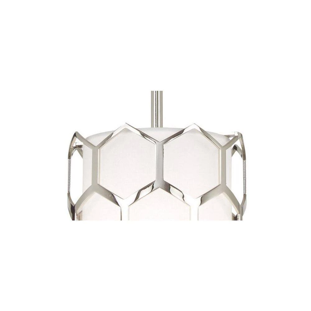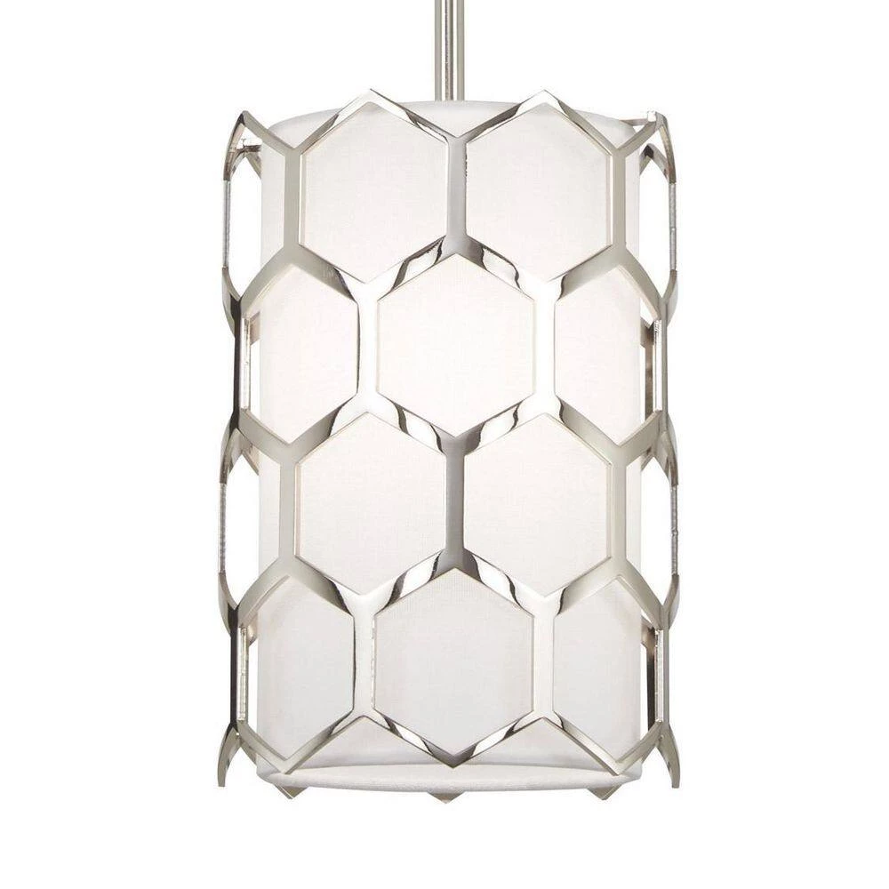 - Featuring a polished nickel hexagons with fine linen drum shades