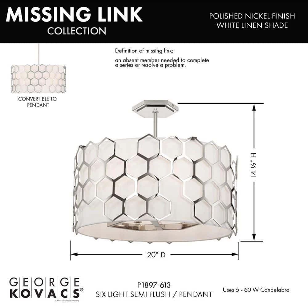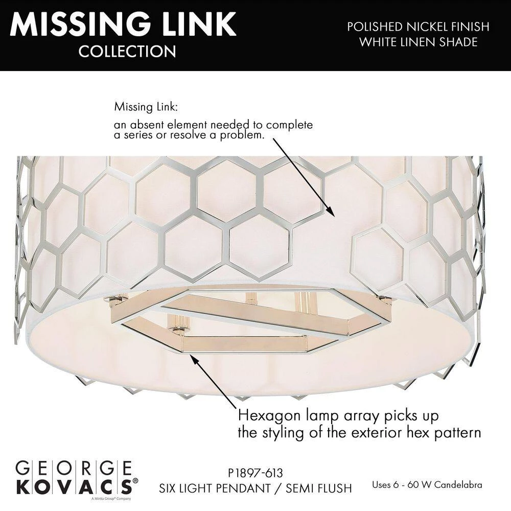Are you mesmerized. Welcome to the Missing Link Collection from George Kovacs Lighting. A halo of Polished Nickel hexagons encompasses fine linen drum shades while the asymmetrical patterning brings an undeniable modern je ne sais quoi to the eye. The dynamic geometric arrangement provides a unique stylistic element while highlighting a transformative interior glow. Designed in 4 different configurations consisting of a 1-light mini-pendant, 3-light pan pendant, 6-light pendant and 6-light pendant convertible to semi-flush. The Missing Link, a modern geometric collection, created and designed by George Kovacs Lighting.