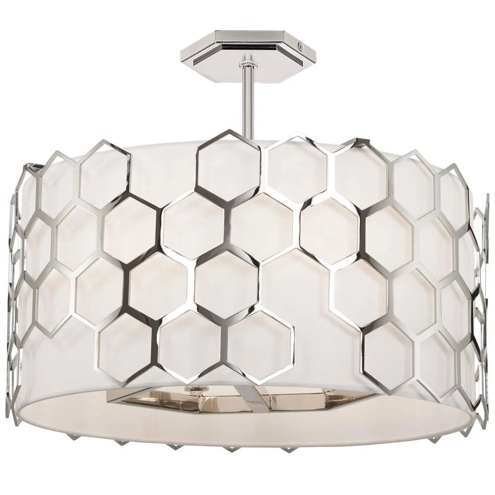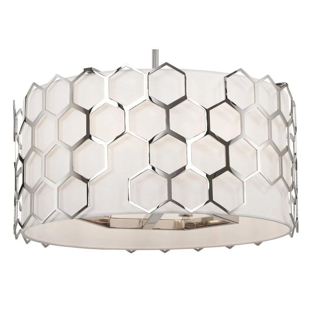 - Featuring a polished nickel hexagons with fine linen drum shades