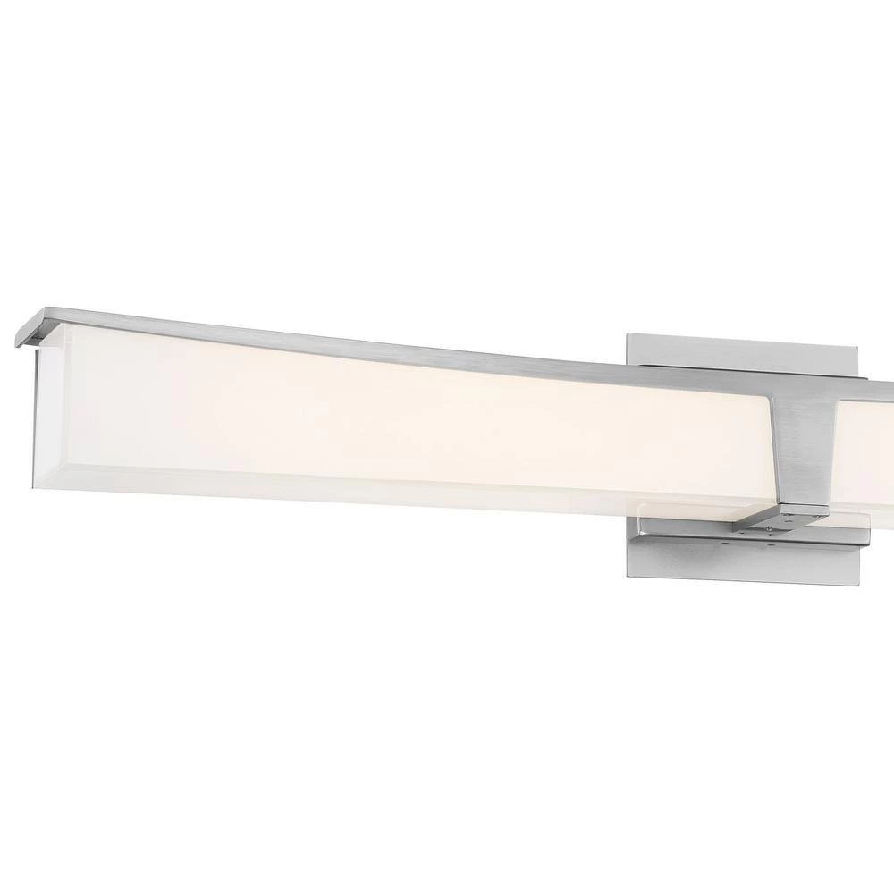 The 30 in. PLANE LED Vanity light from George Kovacs provides a dramatic addition to any bathroom. The Brushed Nickel finish and Frosted Aquarium Glass sets the standard in contemporary vanity lighting. The 40-Watt integrated LED produces over 1950 Lumens to light the largest of bathrooms. Other benefits from the LED light source in the vanity fixture is that it also generates 85% less heat than a typical incandescent fixture helping to keep your bathroom or powder room cool and with the integrated LED light source there are no bulbs to change. Other benefits from the LED light source is that it also generates 85% less heat than a typical incandescent fixture helping to keep your bathroom or powder room cool.
