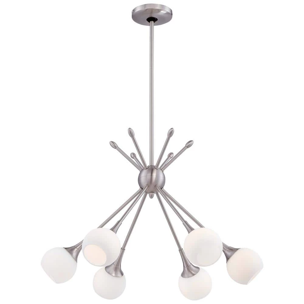 Hypnotic with its nod to a retro aesthetic, the Pontil Collection by George Kovacs features Etched White glass shades suspended from a central sphere. This gorgeous collection is available in a sleek Brushed Nickel or a warm Honey Gold finish and is illuminated with Xenon bulbs. The Pontil collection creates a mid-century silhouette that’s eye-catching.