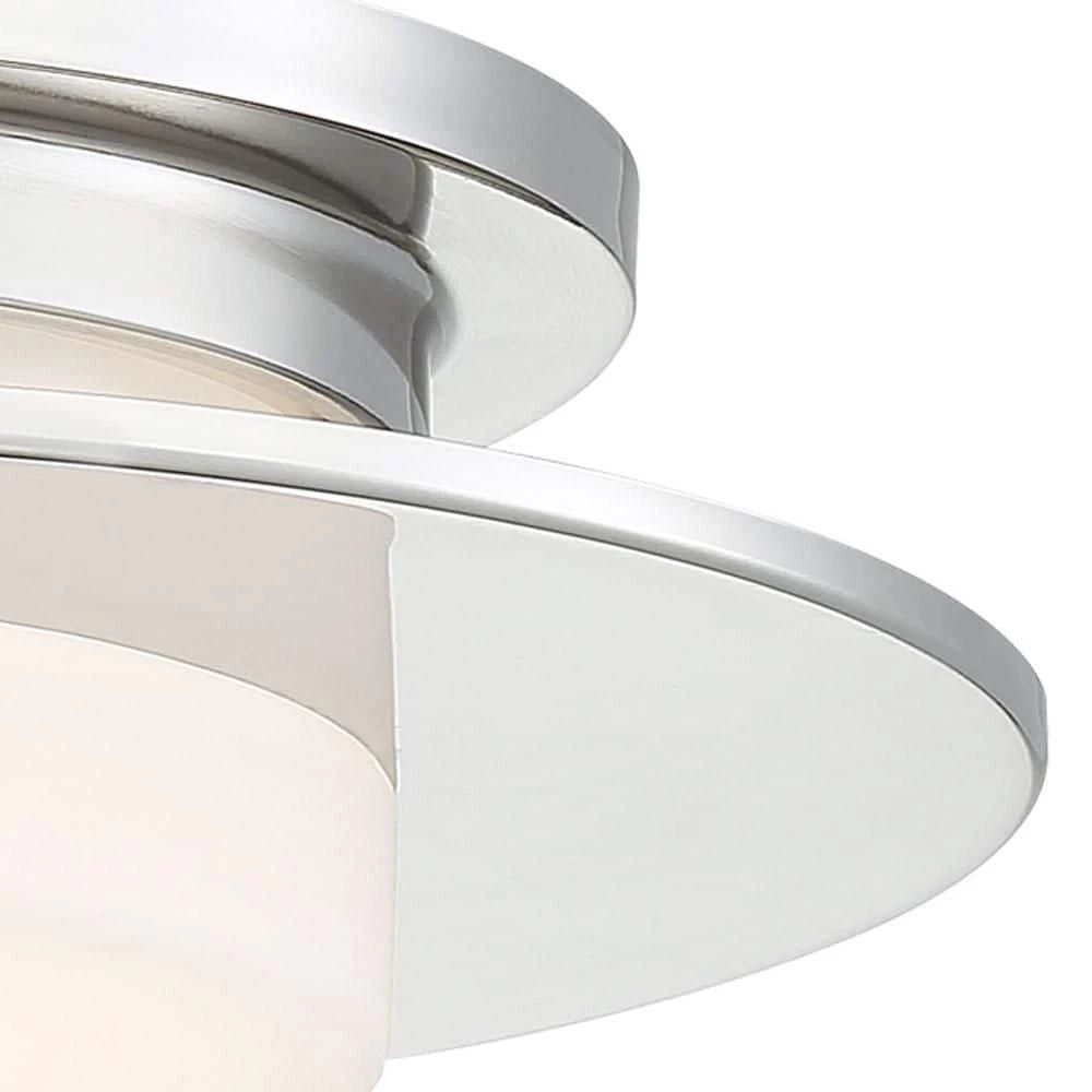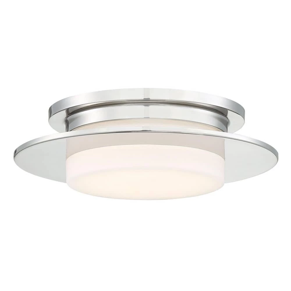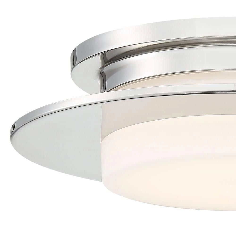 Ready to press the button on increased illumination Get bright with our Polished Nickel and Etched Opal Glass LED flush mount fixture. The Press LED Flush mount by George Kovacs is a simply composed piece, providing a layered distribution of light. Supported by a Steel body, a rounded Opal Glass shade is surrounded by a Steel disk, creating a warm illumination that highlights the ceiling and smooth metallic details of this fixture.