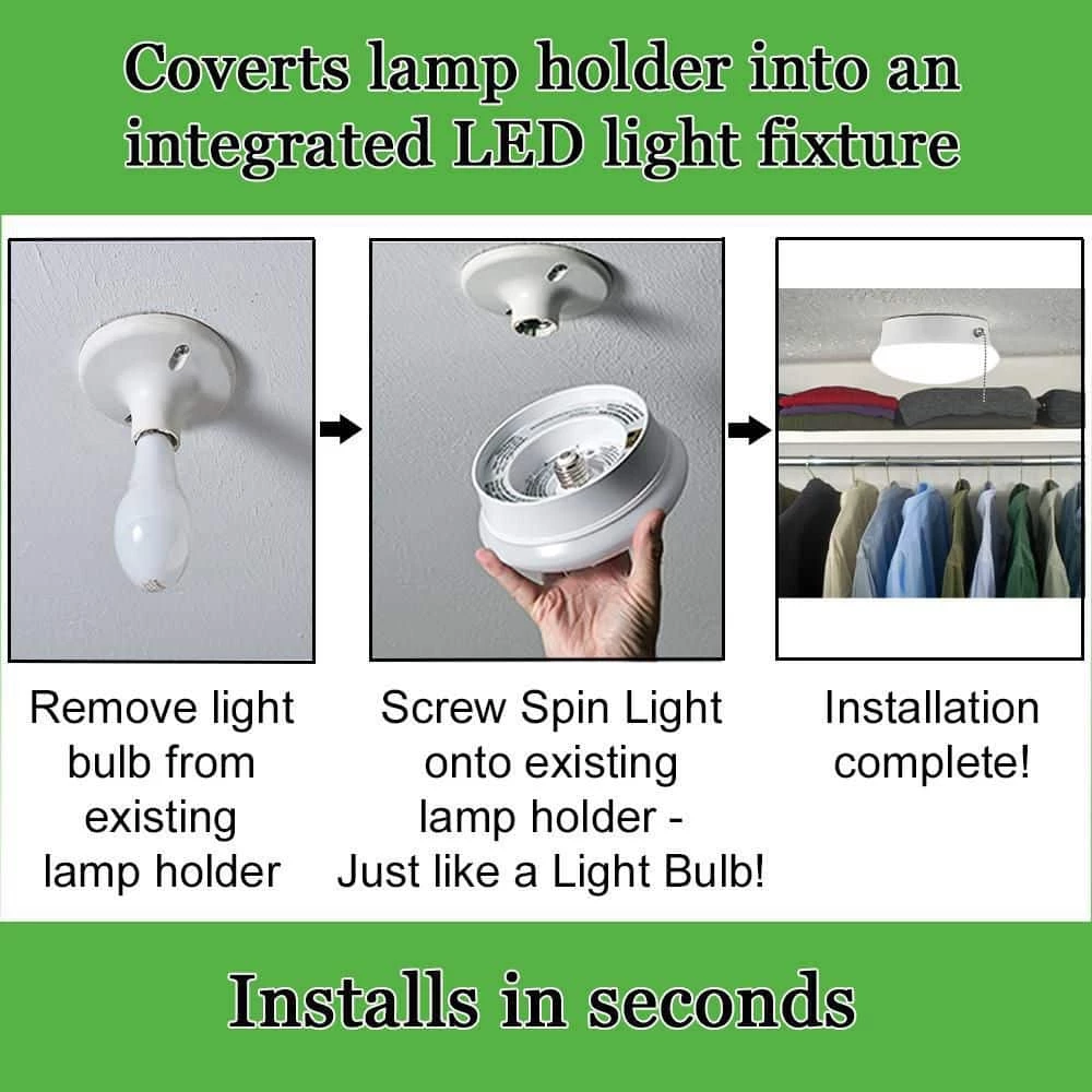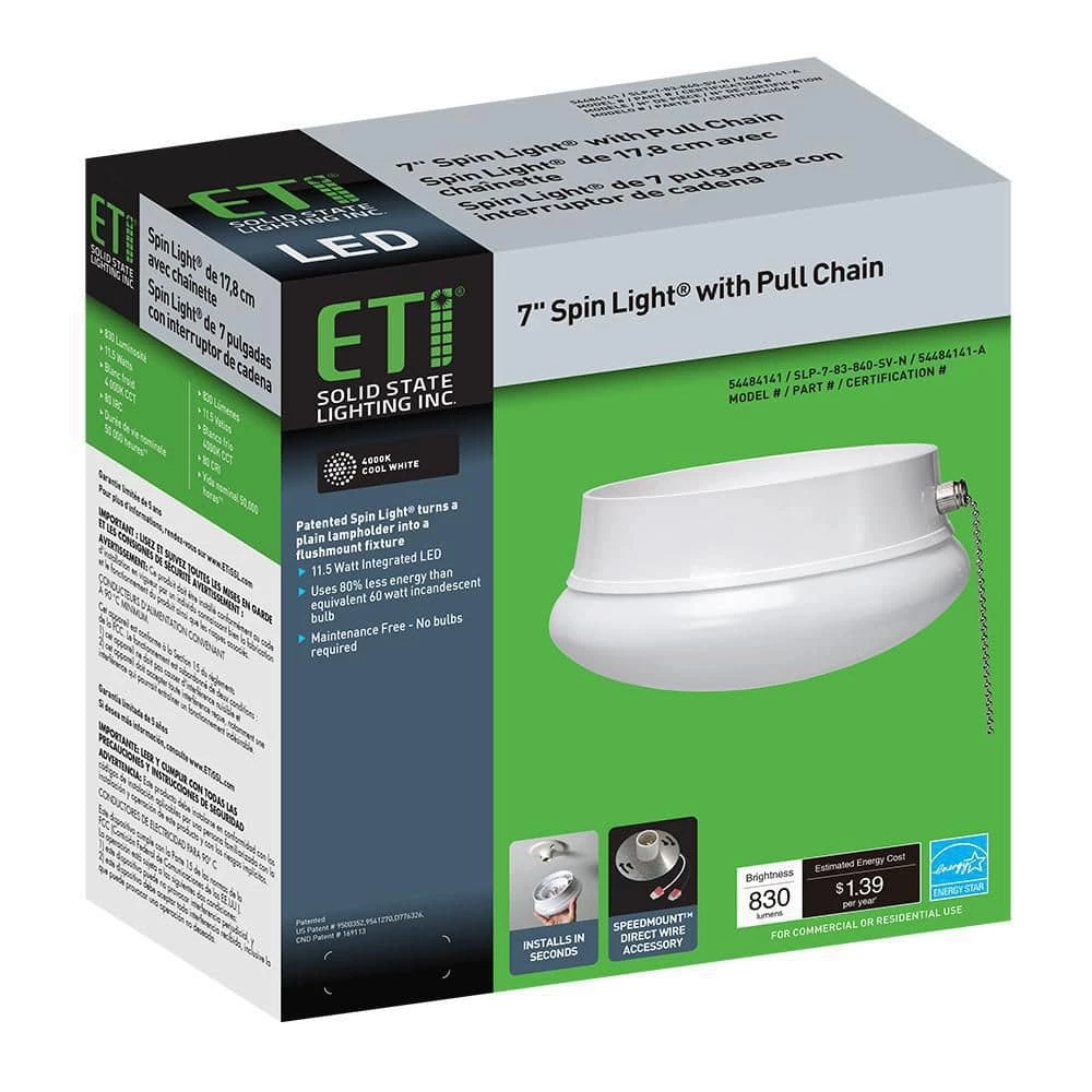 ETi 7in. Spin Light with Pull Chain converts a bare lamp holder into a bright LED flush mount ceiling light. Eliminates the need to rewire and install an entirely new light fixture. Simply screw the fixture onto existing lamp holder just light a light bulb. (Direct wire into junction box with adapter for remodel and new construction installations is included.) This Spin Light replaces a 60-Watt incandescent bulb with its superior LED light engine saving energy, the environment and your wallet. It provides crisp and vibrant illumination with no yellow discoloration or dark spots over time and is maintenance free with absolutely no bulbs required. Great for closets, bathrooms, stairwell, hallway, basement, garage, attic, laundry room, storage room or utility room.