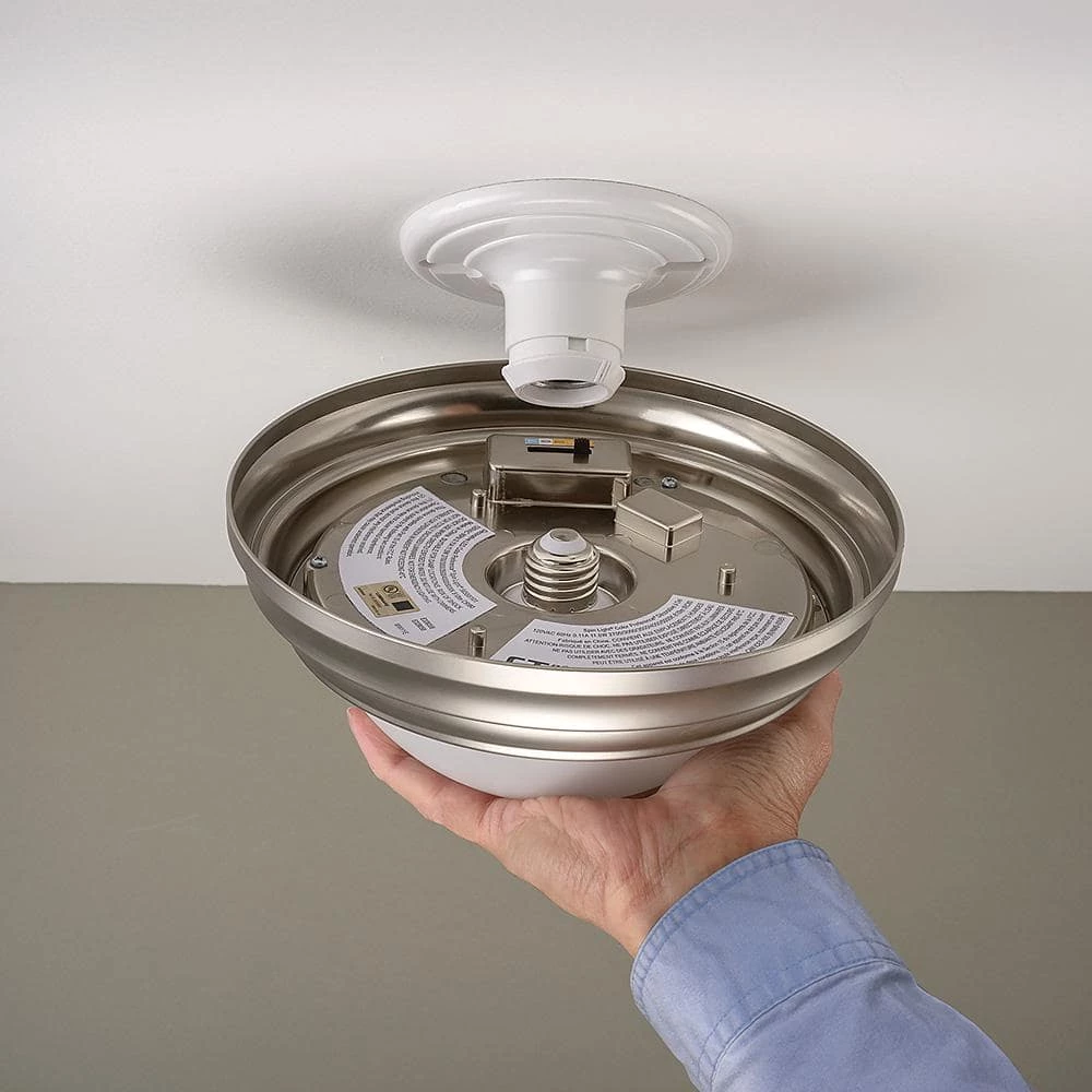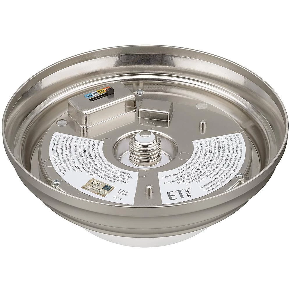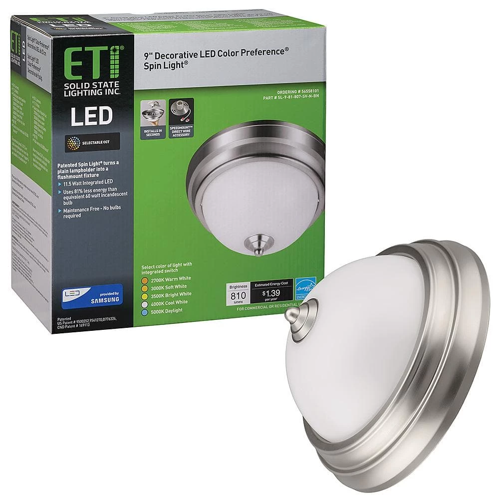 Commercial Electric’s Spin Light 9 in. Brushed Nickel Integrated LED Flush Mount Ceiling Light is a beautiful Contemporary alternative to your typical flush mount. This fixture is designed to simply screw into most existing plastic and porcelain lamp holders without any wiring required. Converts your lamp holder to a fixture in no time at all. *Direct wire option is available using bracket included in box. Also, you preset color temperatures between Warm White, Soft White, Cool White, Bright White or Daylight using toggle switch directly on the back of the fixture. Should you change your mind, remove the fixture and set to another color and it’s dimmable too! Emits premium 810 Lumens of brightness using 11.5-Watts of energy saving electricity, the environment and your wallet. Ideal for closets, pantry, bathrooms, stairways, hallways, laundry room or basement.